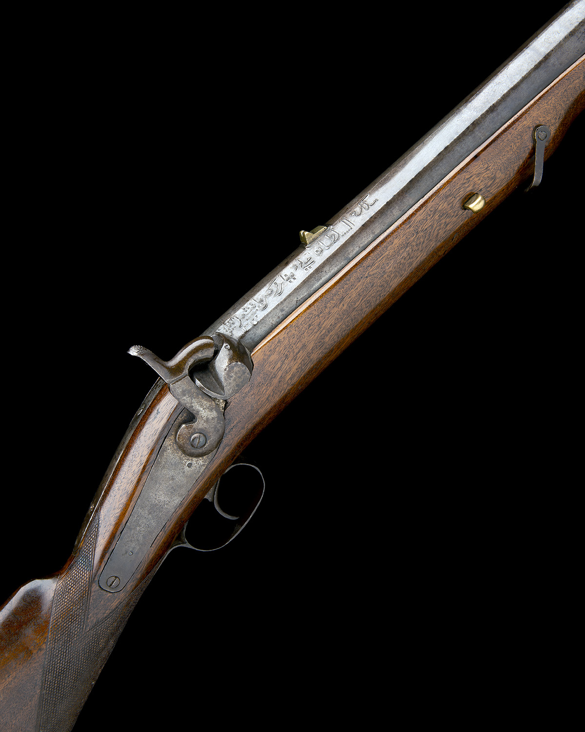 the barrel circa 1840, of octagonal to round heavy profile, 35in. in length and fitted with brass front and rear-sights, farsi inscription to the right hand side top-flat, twin nailed long top-tang, plain back-action lock and hammer, later walnut half-stock chequered at the wrist, single brass barrel-key, iron stirrup swivels and later drum-headed iron ramrod, weight approximately 23lbs.