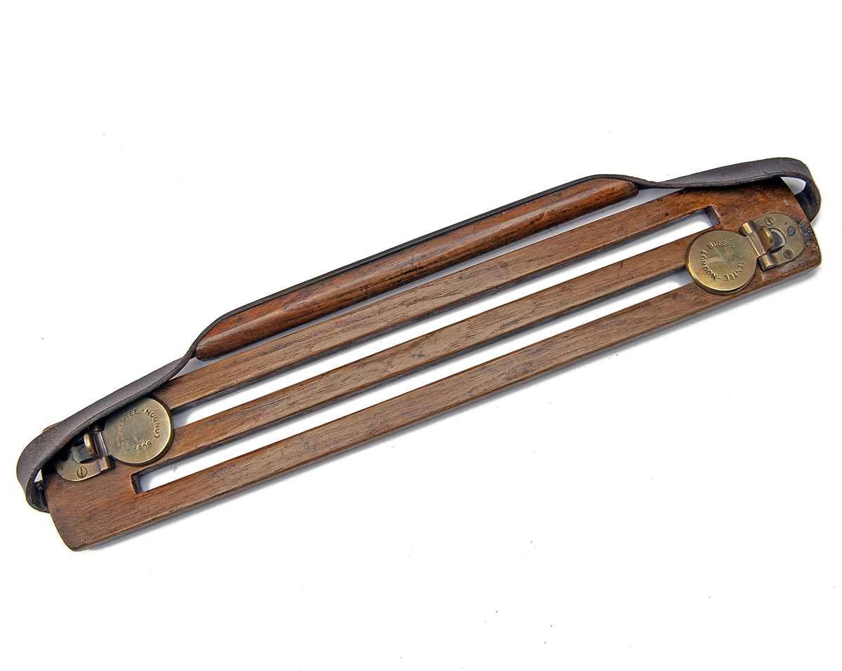 with oak and leather carry handle, two brass catches engraved with 'Bussy Patentee. London', measuring approx. 18in. x 22 3/4in.
