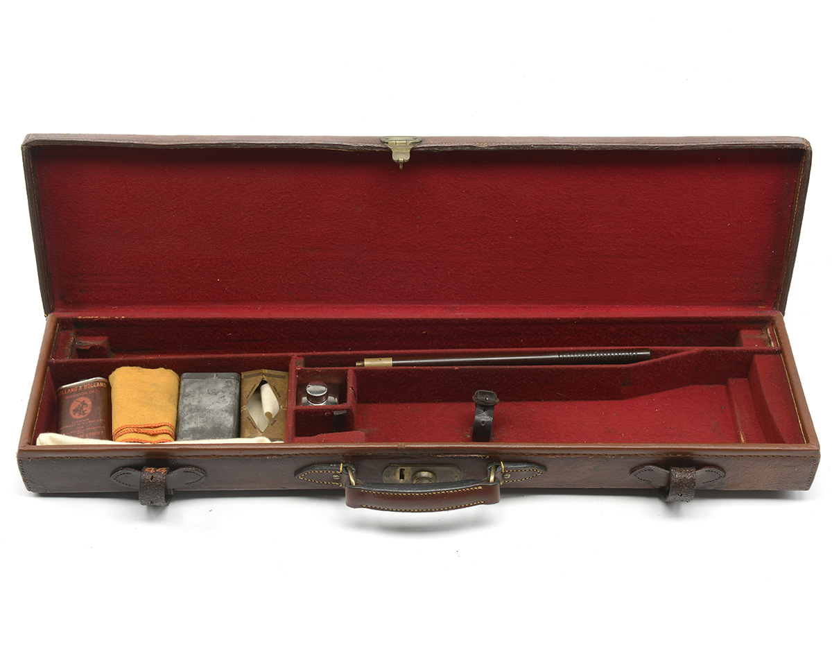 fitted for 30in. barrels, the interior lined with red baize, three-piece cleaning rod, G&J.W. Hawksley oil bottle, cleaning heads, brass lock (key missing), leather seem embossed with 'WESTLEY RICHARDS, BENNETTS HILL, BIRMINGHAM'
