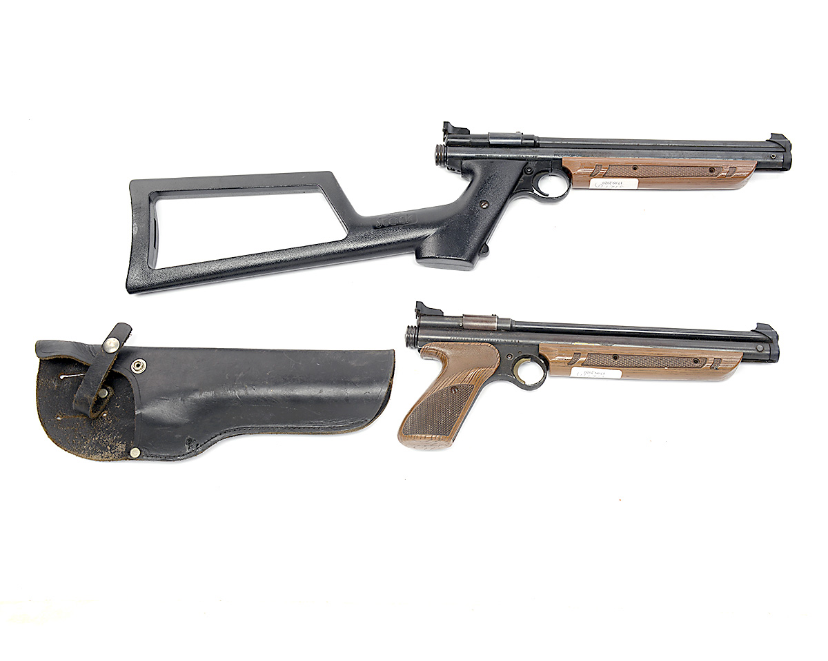 A .177 AND A .22 MULTI=PUMP PNEUMATIC AIR PISTOL SIGNED CROSMAN, MODELS 1322 MEDALLIST & 1377 CLASSIC, serial no's. 578204864 & 790305038, both of similar form, the first requiring seals but complete with leather holster, the second with attached shoulder-stock