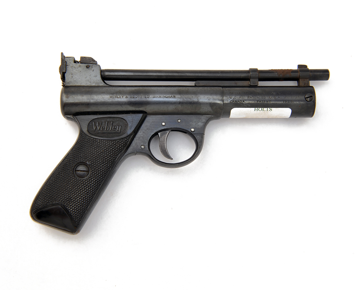 A SCARCE .22 BARREL-COCKING AIR-PISTOL SIGNED WEBLEY & SCOTT, MODEL 'PRE-WAR MKI SLANT-GRIP', serial no. 56157, with 7 1/8in. blued barrel, reblued air-chamber, missing trigger weight adjustment screws, chequered black hard-rubber grips, some corrosion