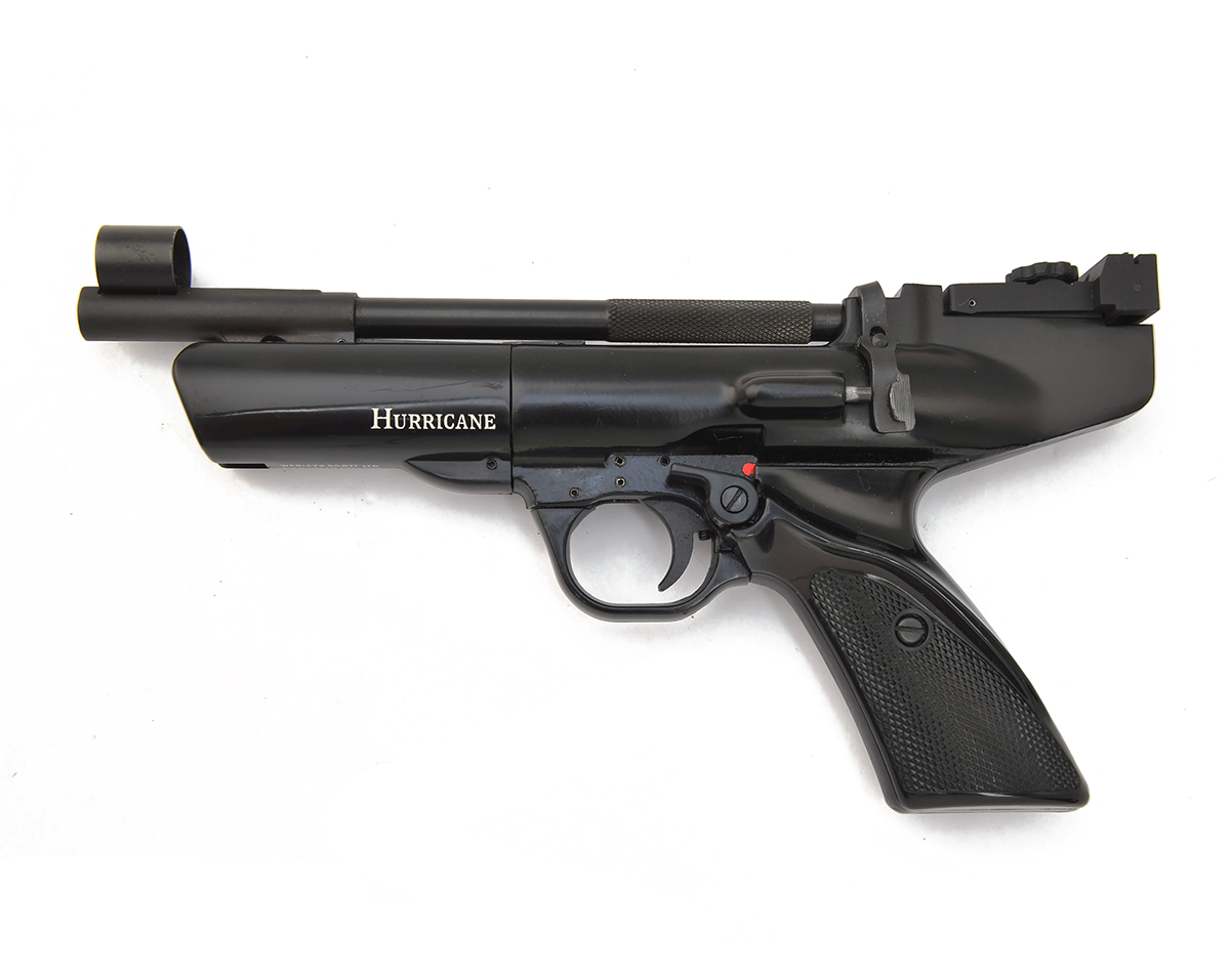 A .22 BARREL-COCKING AIR-PISTOL SIGNED WEBLEY & SCOTT, MODEL HURRICANE, no visible serial number,