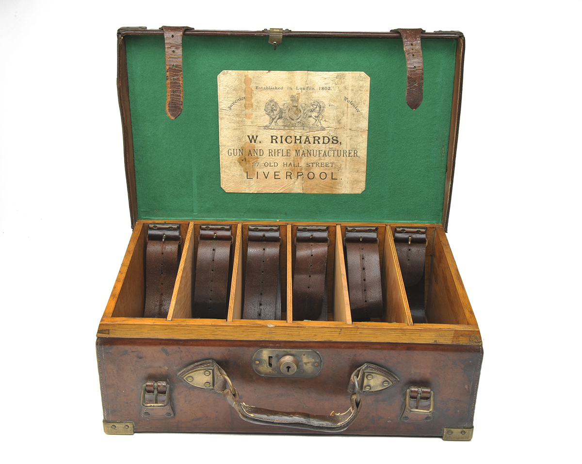 W. RICHARDS A BRASS-CORNERED OAK AND LEATHER CARTRIDGE MAGAZINE,