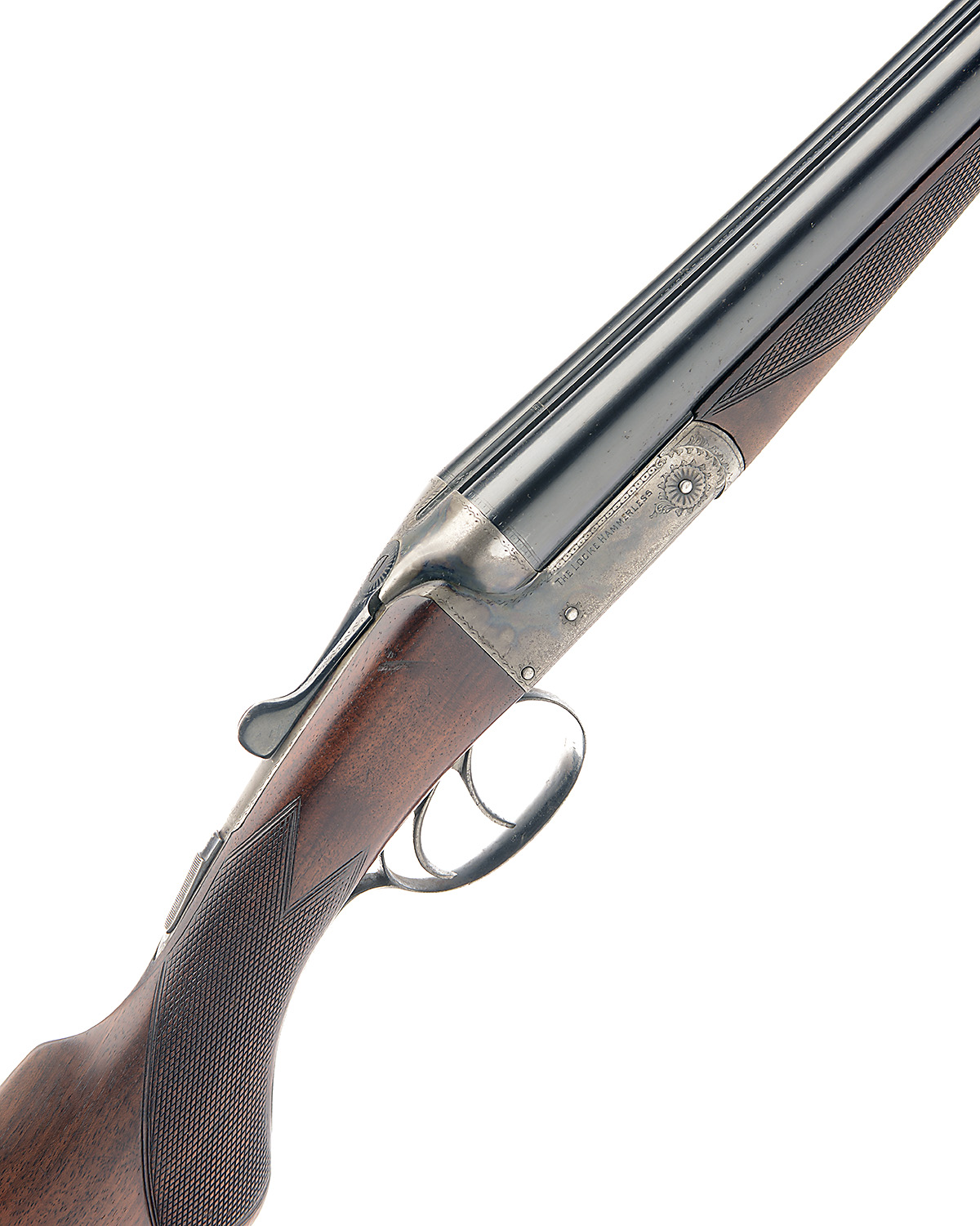 WALTER LOCKE & CO. 16-BORE 'THE LOCKE HAMMERLESS' BOXLOCK NON-EJECTOR, serial no. 6983, 30in. nitro barrels, the rib engraved 'WALTER LOCKE & CO. LTD. CALCUTTA. DELHI & LAHORE.', 2 1/2in. chambers, bored approx. true cyl. and 1/2 choke, treble-grip action with removable striker discs, automatic safety, beaded and threaded border engraving, the sides engraved 'THE LOCKE HAMMERLESS', retaining some original colour-hardening and finish, 14 1/4in. semi-pistolgrip stock, weight 6lb. 8oz., in a canvas case and with a gunslip
