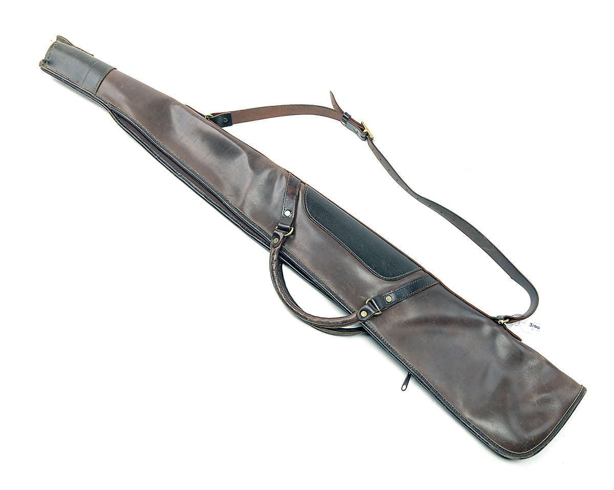 A LEATHER FLEECE-LINED SINGLE GUNSLIP, with leather shoulder strap and brass fittings
