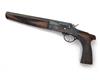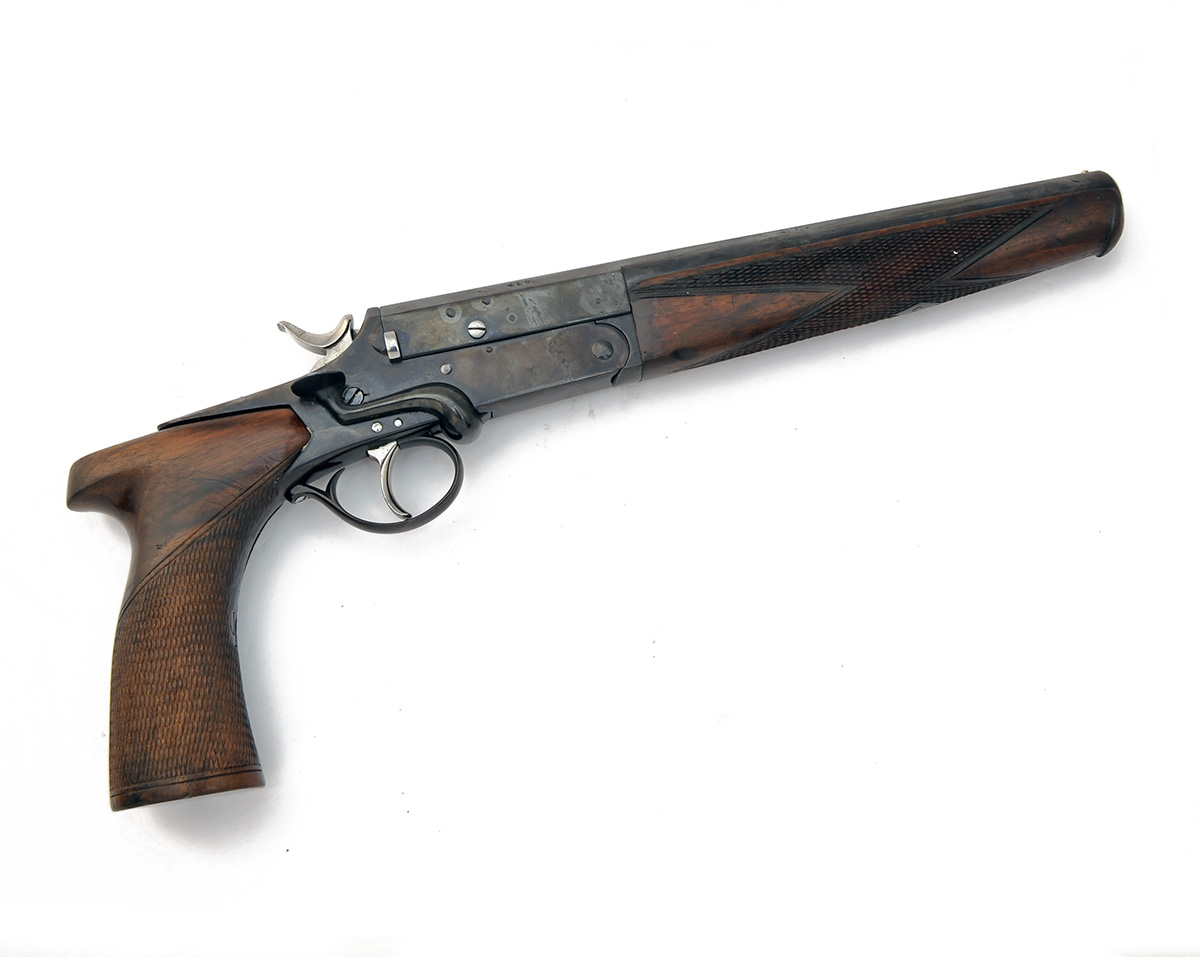 A .410 (2 1/2in.) SINGLE-BARRELLED SHOT-PISTOL SIGNED COGSWELL & HARRISON, serial no. 17942, converted from an earlier rook-rifle, with 10in. re-blued barrel, flat sighting plane with bead fore-sight, side-lever action with exposed hammer, chequered walnut semi-saw handled grip and chequered walnut full-length fore-end