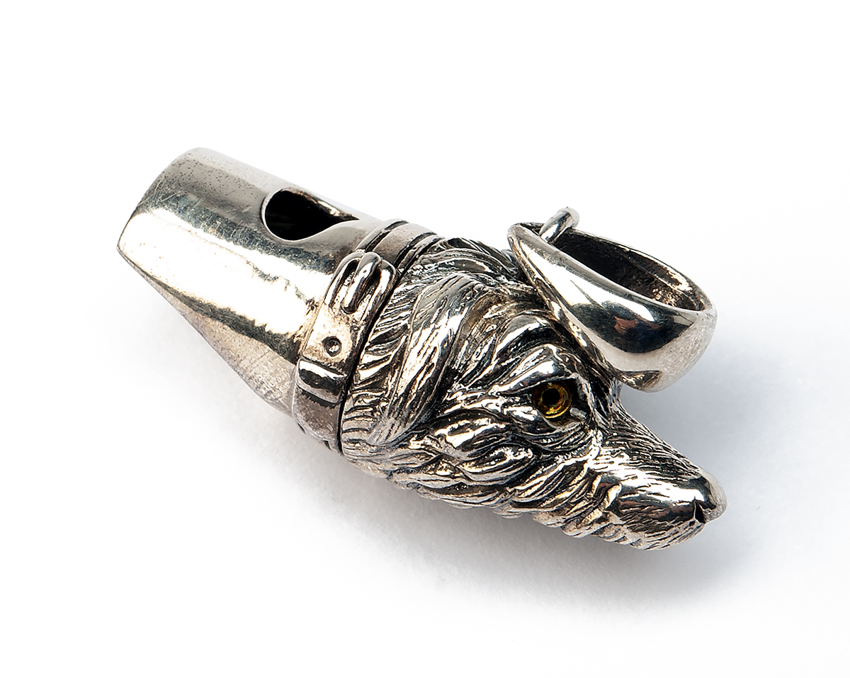 marked 'STERLING', with glass eyes and lanyard ring, measuring approx. 1in.