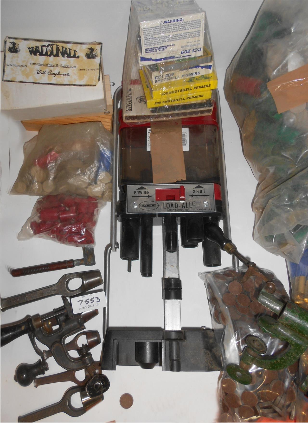 A 12 BORE LEE LOADER, 2 ROLL TURNOVER LOADERS, WADS, CARDS, 600 PRIMERS, 100 PRIMED NEW CASES 12 BORE, 50 10 BORE CASES, 6 PUNCHES Please be advised that cartridges/ammunition, primers, primed cases, blanks and percussion caps cannot be sent or exported to you by post or carrier. Due to this rule, within 30 days of the sale date, please arrange with our shipping department a collection at one of our regional valuation days on mainland UK, or, you would be most welcome to collect from our offices at PE31 6HA in Norfolk. If collection is not arranged within 30 days, that will indicate that the items are not required and they will be offered in our next sale