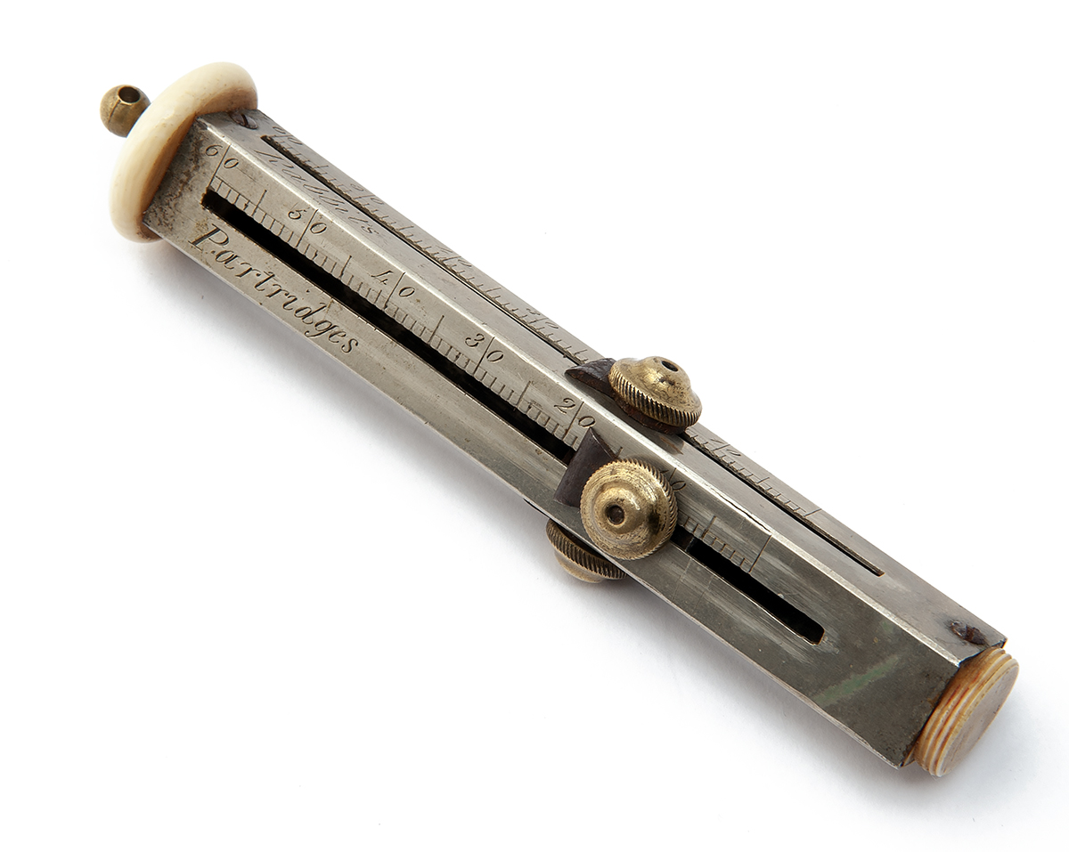 measuring approx. 4 1/4in., square pillar design, each facet with sliding counters for pheasant, hare, partridge and grouse