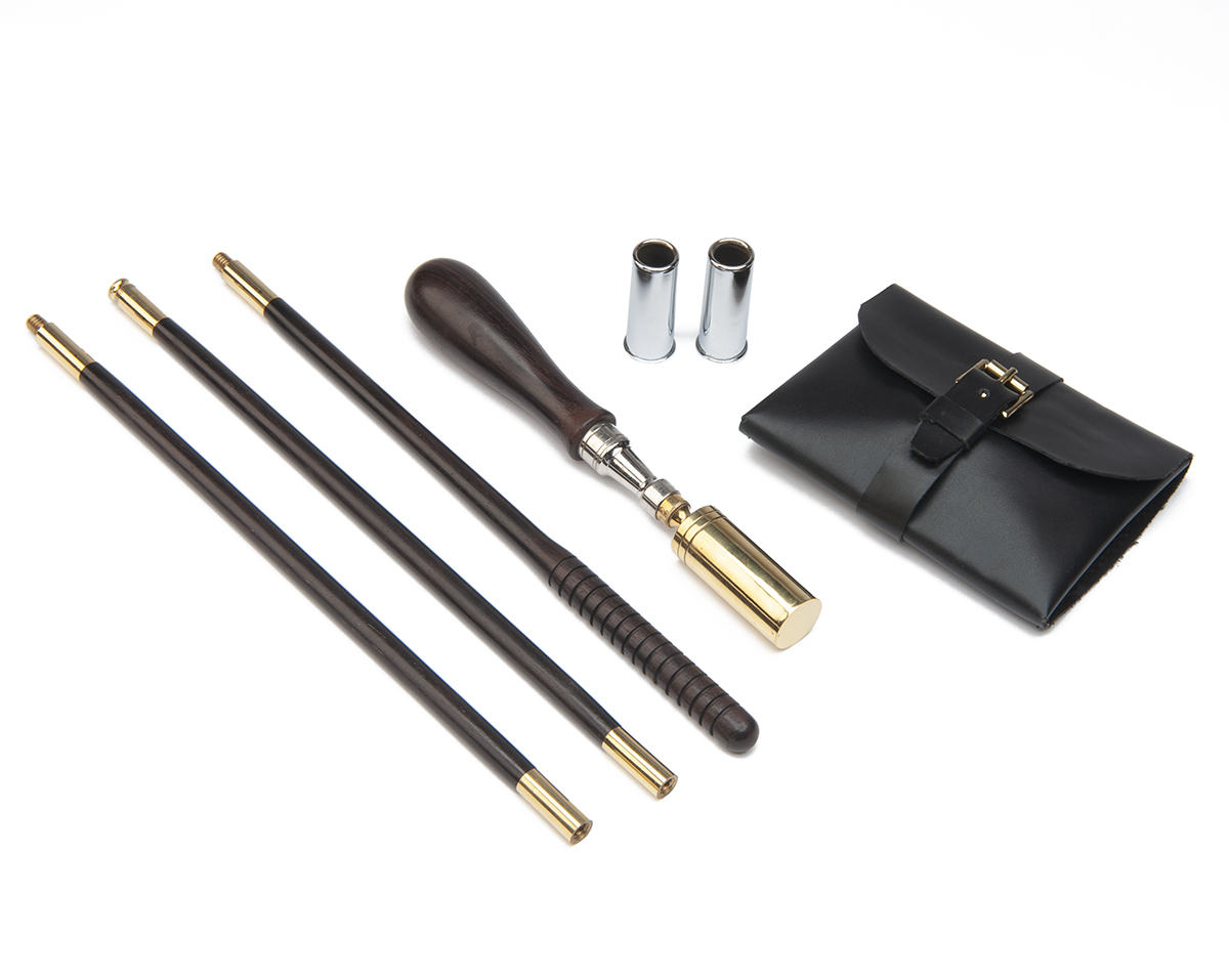 comprising of a pair of snap-caps, chamber brush, three-piece cleaning rod, leather wallet with mop, jag, brush