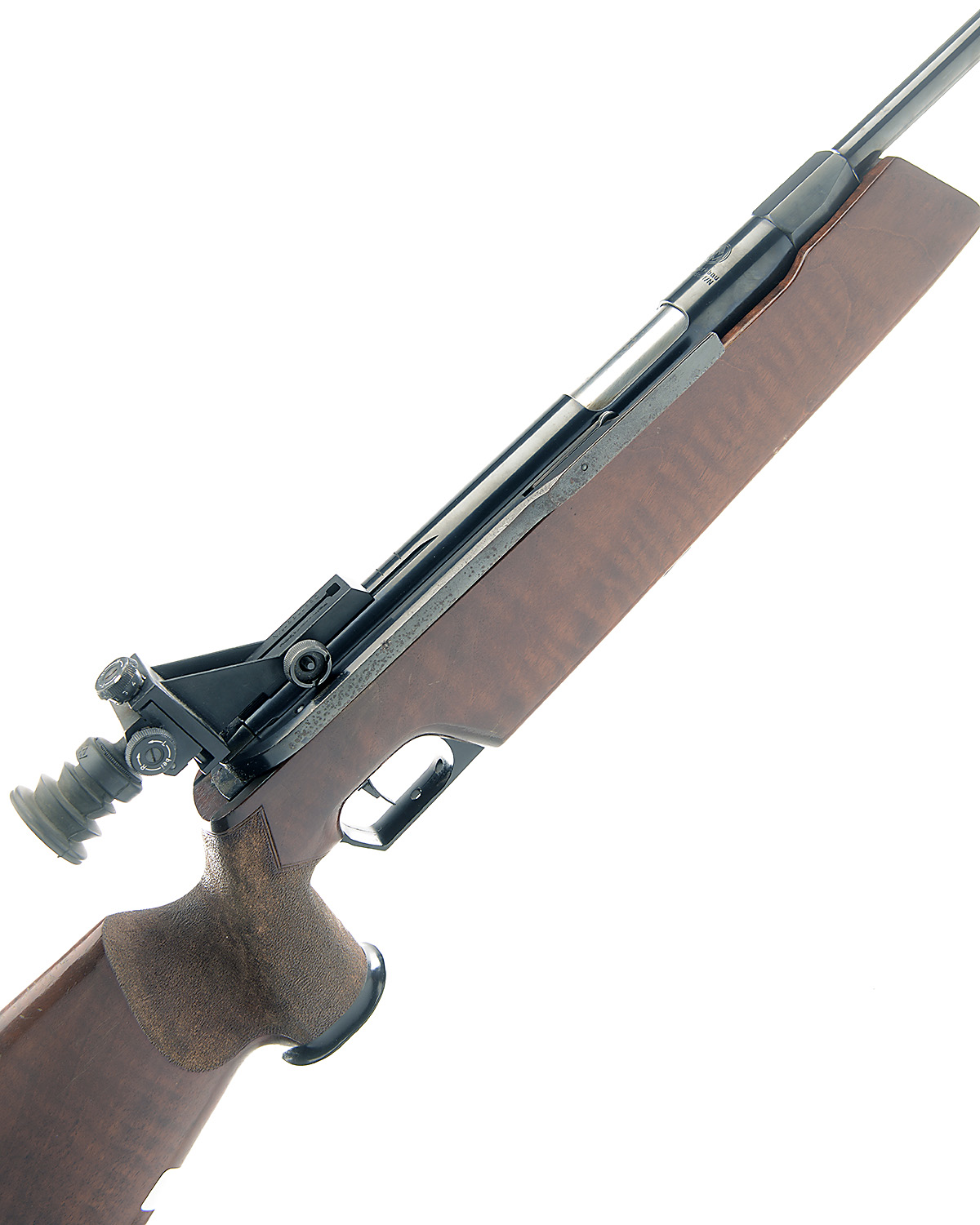 A .177 SIDE-LEVER RECOILLESS MATCH AIR-RIFLE SIGNED FEINWERKBAU, MODEL '300S', serial no. 103665, with blued 19 1/2in. barrel, tunnel fore-sight, sliding breech, blued air-chamber with diopter rear-sight and anatomical walnut stock