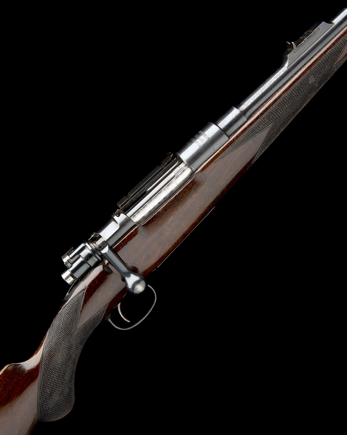25 1/4in. nitro barrel engraved 'JOHN RIGBY & CO. 43 SACKVILLE ST. LONDON. W.', and 'SIGHTED FOR RIGBY'S SPECIAL .275 BORE HIGH VELOCITY CARTRIDGES POINTED BULLETS 140 GRAINS', block-mounted open sights with two folding leaf sights, ramp-mounted bead fore-sight, the receiver side-mounted with a Bisley Deluxe 4x32 telescopic sight, serial no. 52085, in quickly-detachable mounts, receiver ring engraved 'WAFFENFABRIK MAUSER A-G OBERNDORF 1910', and numbered 34299, detachable floorplate with military style release, the triggerguard numbered 3751, figured semi-pistolgrip stock (cracked at hand) with sling eyes and steel buttplate, weight 7lb. 11oz. (unscoped) and 8lb. 12oz. (with scope), in its full length leather rifle case with some accessories