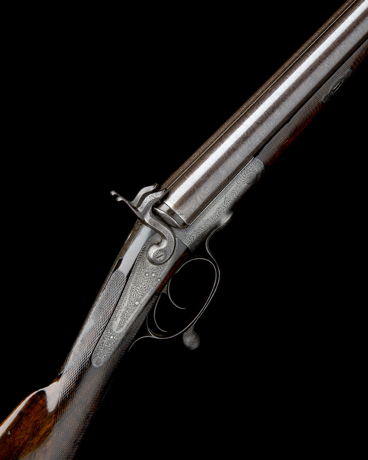 serial number visible to fore-end wood only, number on triggerguard ground off, 30in. black powder only damascus barrels, the rib engraved 'WOODWARD. 64 ST. JAMES'S STREET. LONDON.' (faint), narrow carved fences, non-rebounding back-action locks with faceted hammers signed 'WOODWARD', ropework bordering and bold acanthus scroll engraving, brushed finish, 14 1/4in. figured stock including steel buttplate, fore-end with cross-pin release, missing finial