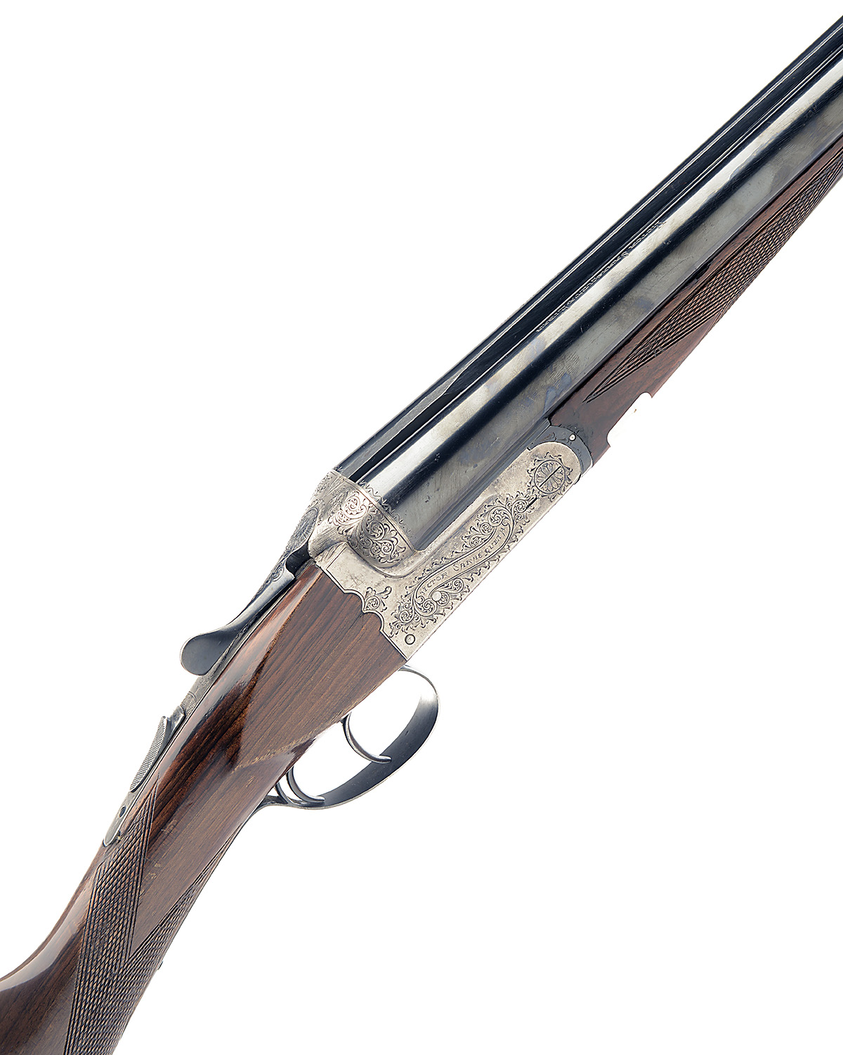 25 3/4in. nitro barrels with Churchill-style rib, 2 3/4in. chambers, bored approx. true cyl. and 3/4 choke, automatic safety, removable striker discs, scroll-backed bolstered action, border and partial scroll engraving, bright finish, 14 3/4in. stock with rubber recoil pad boot;