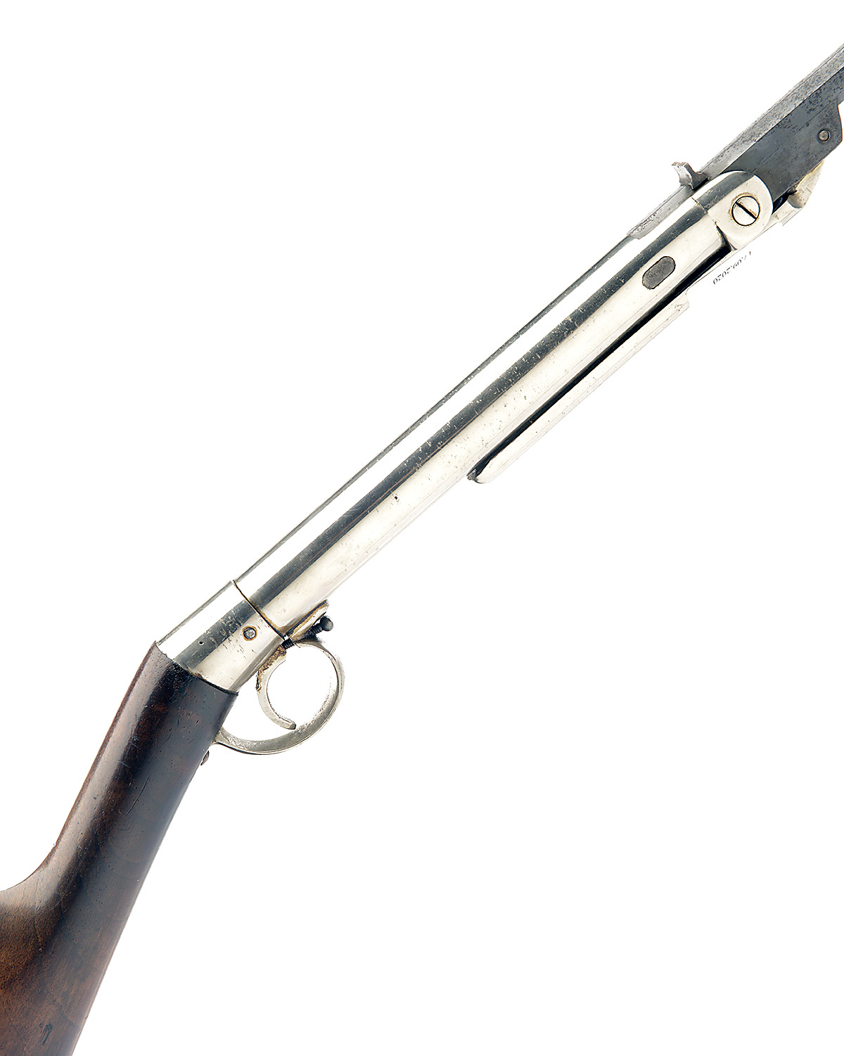 A .177 BREAK-BARREL AIR-RIFLE SIGNED MILLITA, MODEL 'PUSH BUTTON MILLITA', serial no. 54914, possibly for 1914, with two-stage 17 1/2in. barrel marked on the underside 'MADE ABROAD', push-button barrel lock, nickel plated air-chamber and walnut straight hand butt-stock, collector's condition