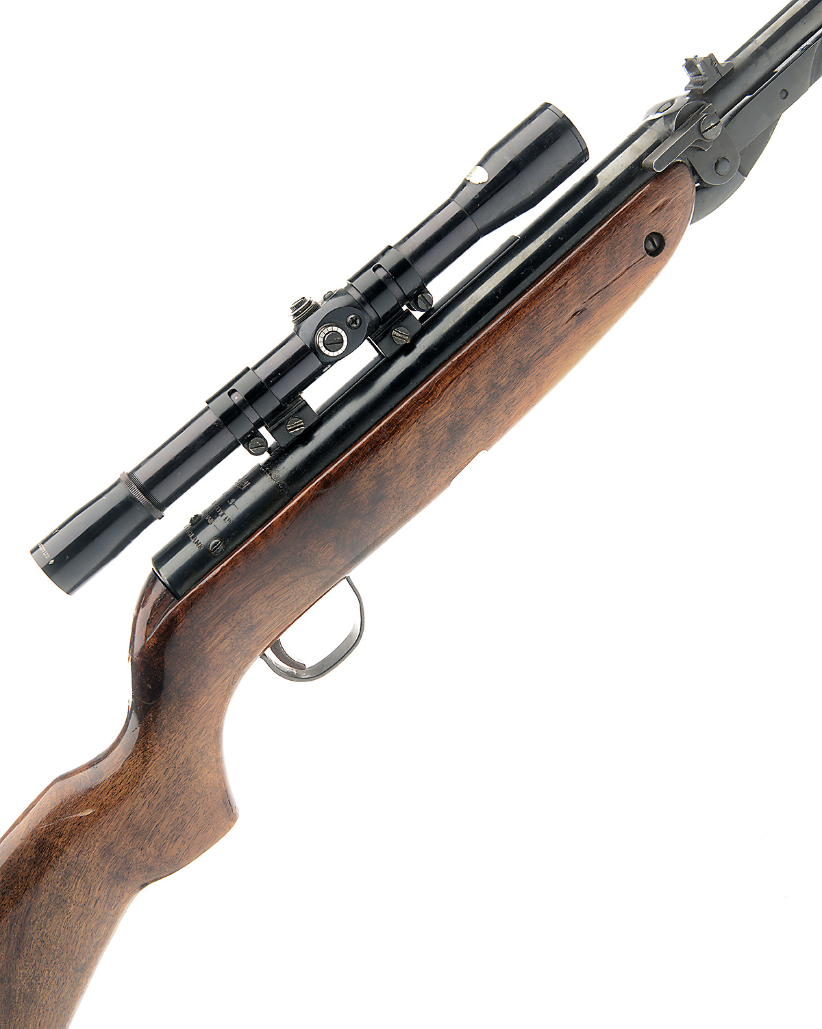 A .22 UNDER-LEVER AIR-RIFLE SIGNED WEBLEY & SCOTT, MODEL 'MK3', serial no. A1524, with blued and sighted 18 1/2in. barrel retaining fore-sight protector, blued air-chamber with applied telescopic sight rail and walnut half-stock, fitted with a Webley 4x20 telescopic sight, generally collector's condition