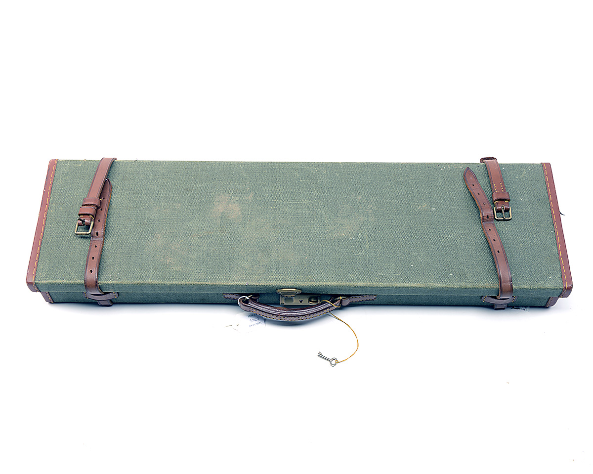 A BRADY CANVAS AND LEATHER SINGLE GUNCASE, fitted for 28in. barrels, the interior lined with green baize, bass lock (including key)