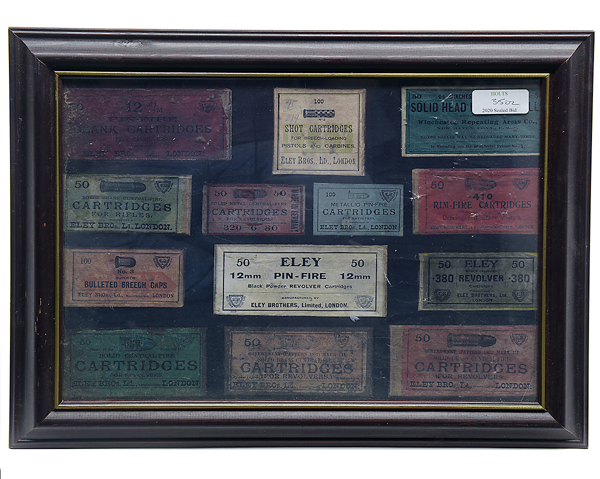 PICTURE OF AN EARLY COLLECTION OF PISTOL CASE TRADE LABELS, set in a modern frame, measuring approx. 20in. x 16in.
