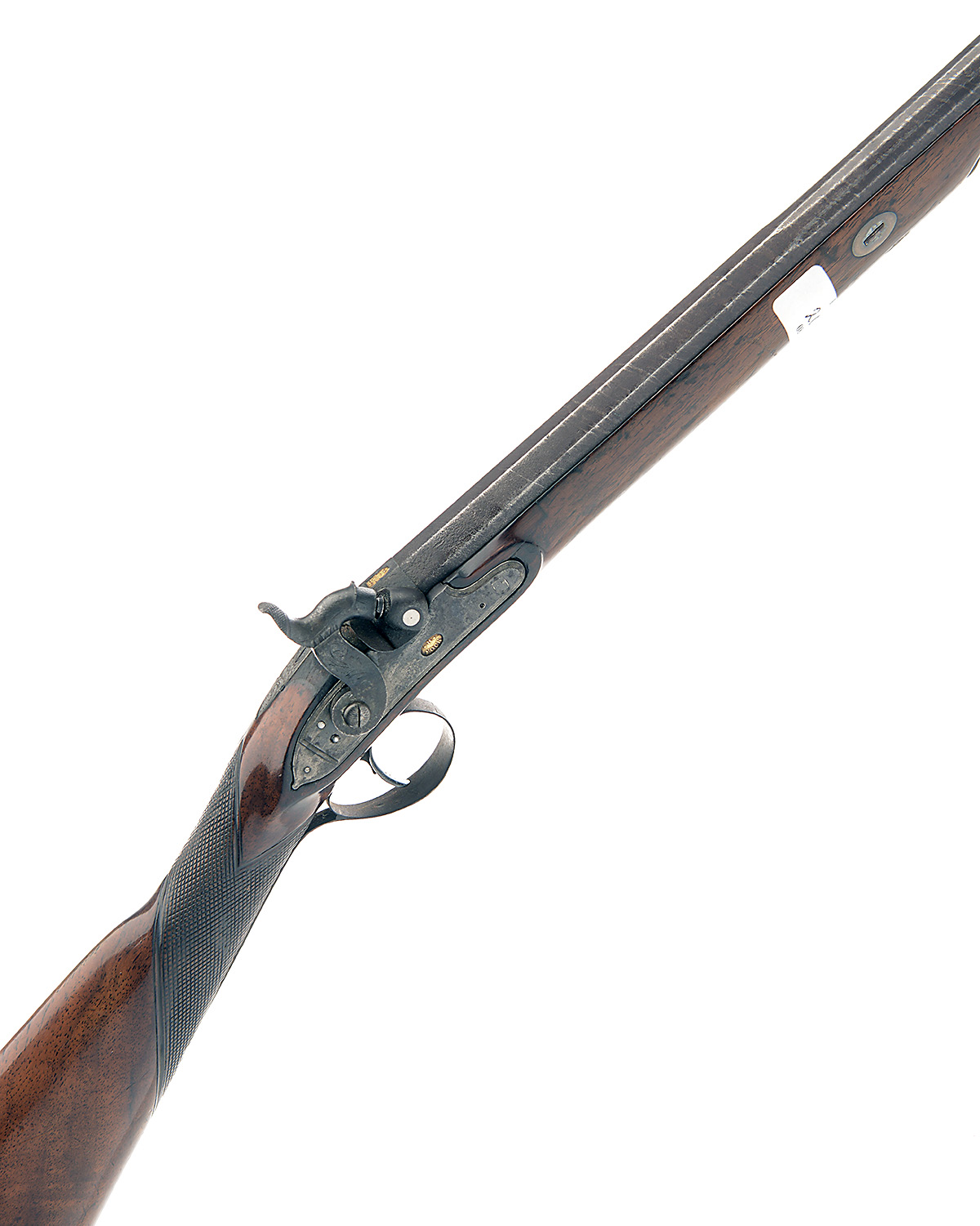circa 1800 and originally flintlock, with octagonal to sixteen-sided to round 29in. barrel signed by the maker in a rectangular gold poincon at breech, later converted bar action lock signed in an oval gold poincon, walnut half-stock chequered at the wrist and iron furniture