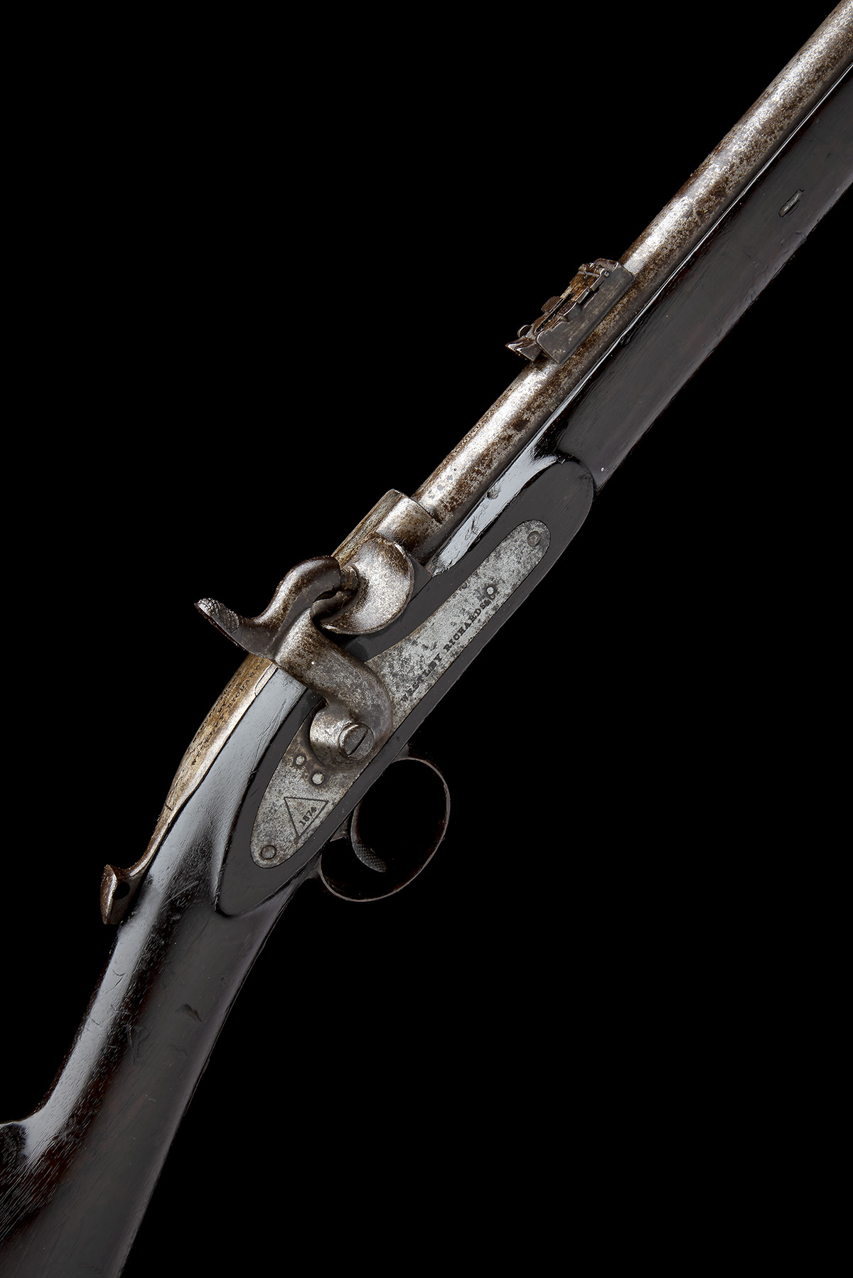 dated for 1874, with 25in. barrel marked 'WHITWORTH PATENT' near the breech, block and blade fore-sight, short elevating ladder rear-sight, lift-up breech to rear marked 'MANUFACTURED BY WESTLEY RICHARDS' together with the triangle trademark, plain bar-action lock signed 'WESTLEY RICHARDS' also featuring the triangle trademark and date, walnut full-stock, iron furniture and single barrel-band, clearing rod absent, finish darkly stained, 41in. overall