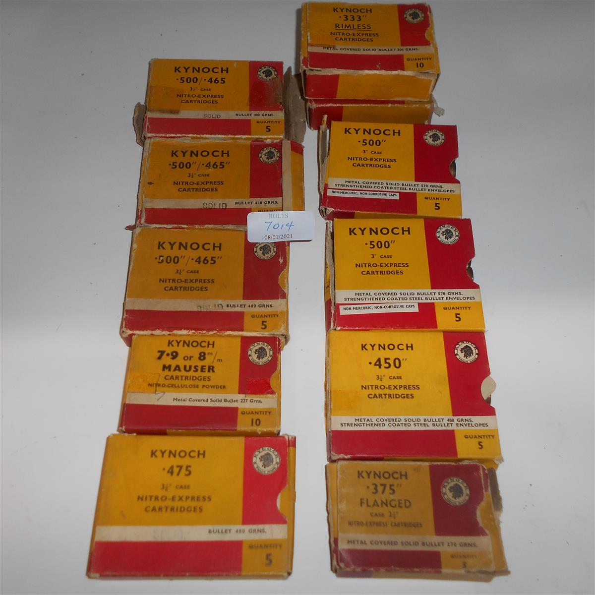 60 ROUNDS OF HIGHLY COLLECTABLE KYNOCH BIG GAME AMMUNITION, comprising of some discoloured cartridges and a few with corrosion,