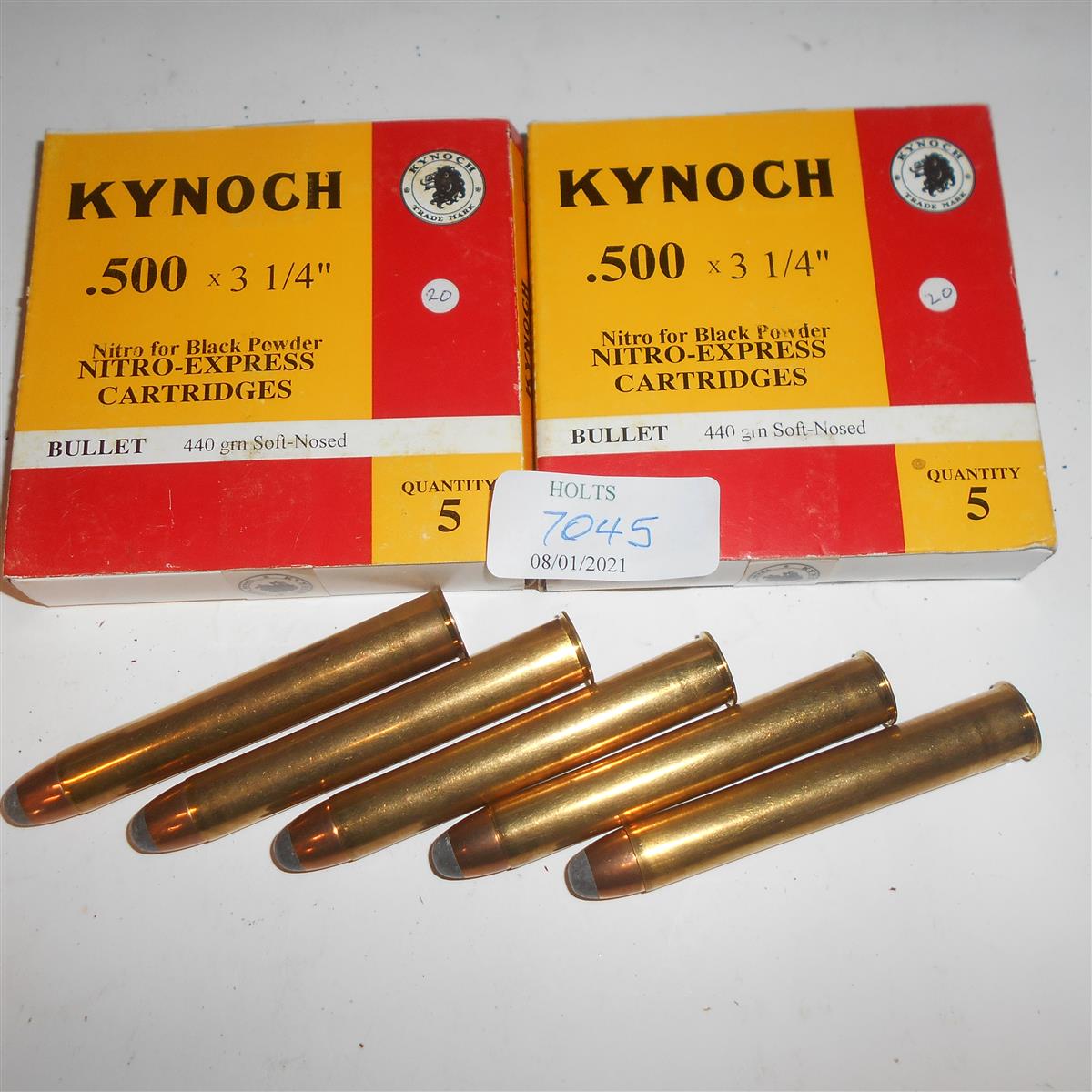 10 ROUNDS SCARCE .500 x 3 1/4in. NE AMMUNITION, FOR BLACK POWDER RIFLES, 440 GRN SOFT NOSE BY KYNAMCO, Please be advised that ammunition, primers, primed cases, blanks and percussion caps cannot be sent to you by post or carrier. If you wish you can book a collection at one of our regional valuation days or collect from our offices at PE31 6HA in Norfolk