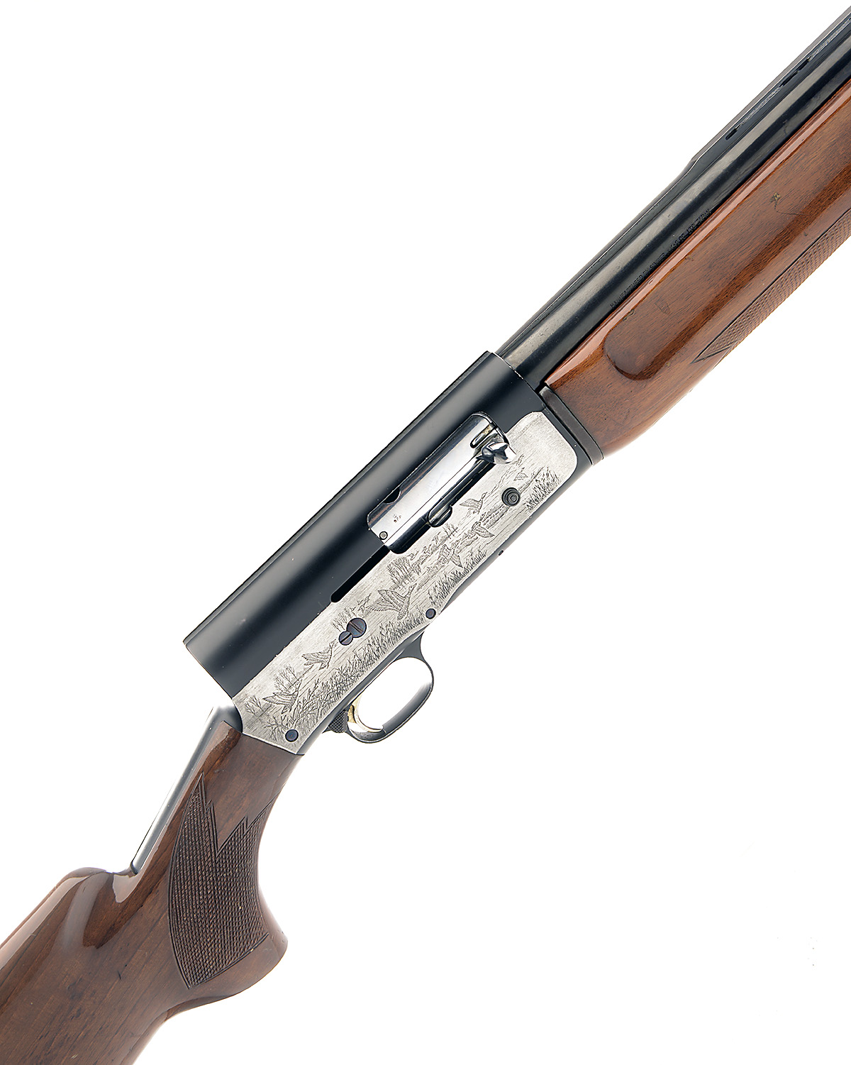 DAIWA 12-BORE 'AUTO-500' SEMI-AUTO SHOTGUN, serial no. NP221178, restricted magazine, 28in. nitro barrel with raised ventilated matt rib, 2 3/4in. chamber, bored approx. 1/2 choke, manual button safety, magazine cut-off switch, gold-washed trigger, blacked action with silver side panels engraved with game scenes, 14in. pistolgrip stock including trademark buttplate, sling swivels