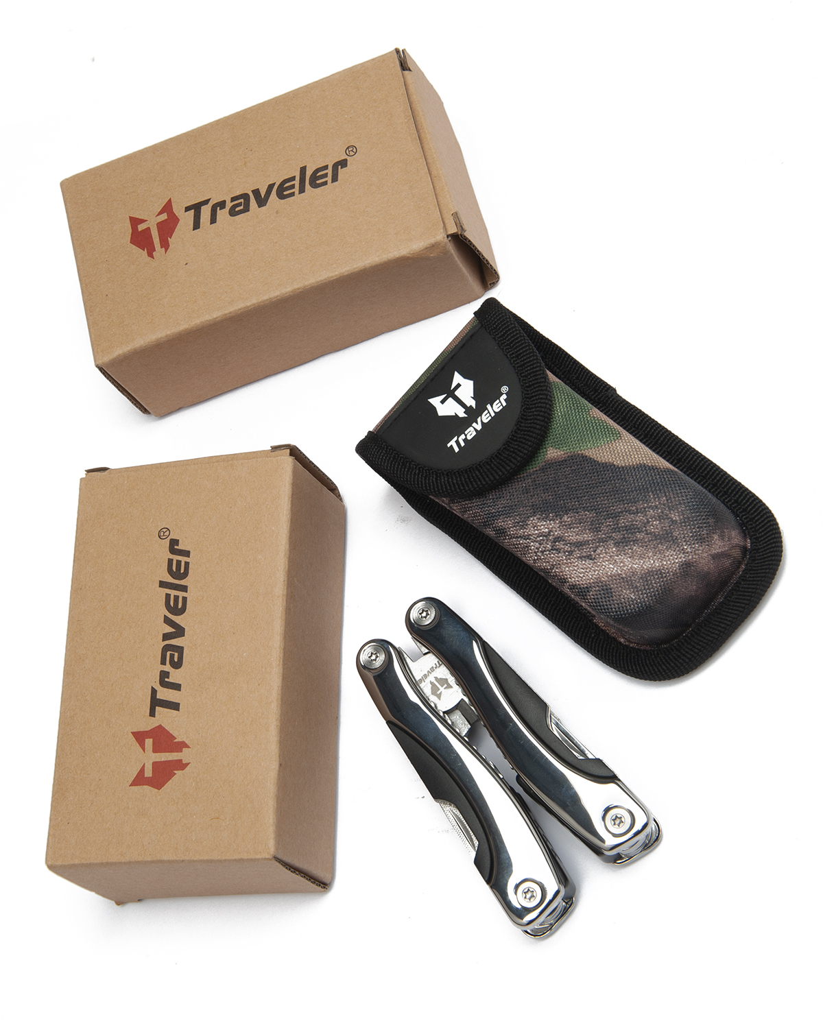TWO UNUSED TRAVELER MULTI-TOOLS, both with camouflage canvas belt scabbards