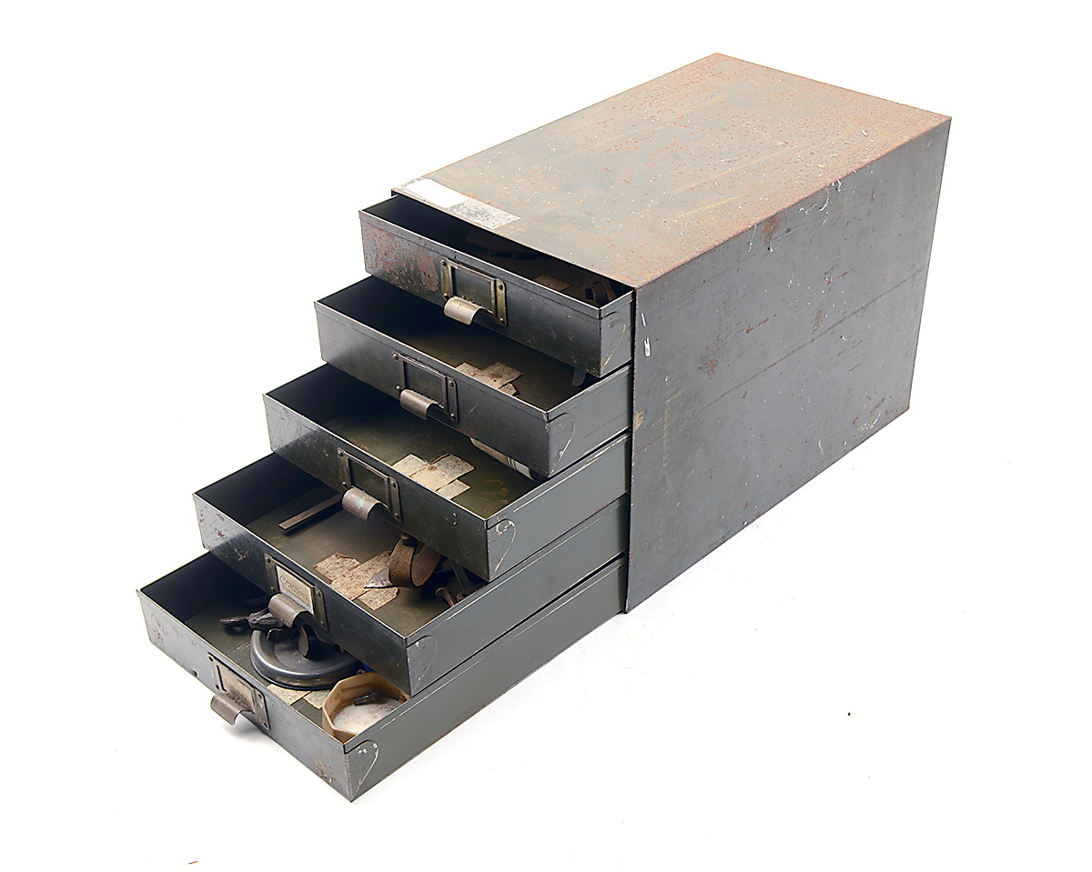 A VINTAGE FIVE DRAWER CABINET CONTAINING GUN PARTS,