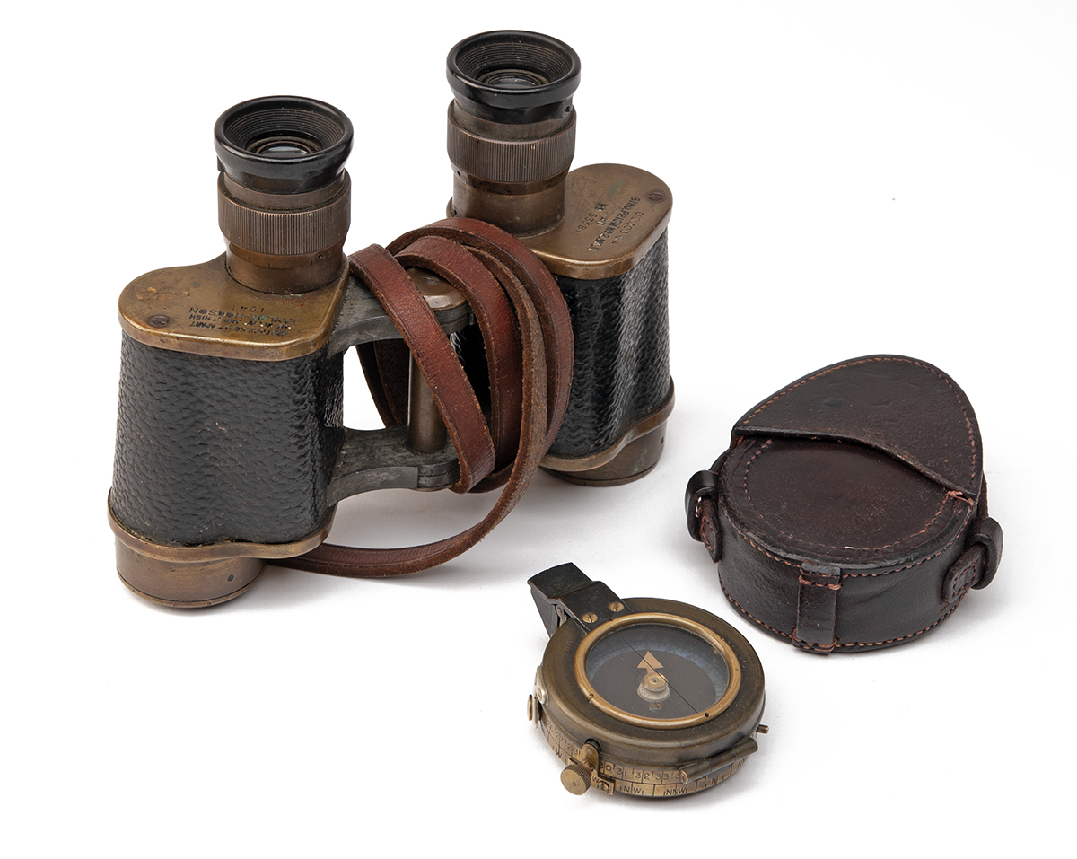 A VERNER'S PATTERN WW1 MILITARY MARCHING COMPASS AND A PAIR OF WW2 ISSUE BINOCULARS SIGNED 'TAYLOR-HOBSON', the first dated 1917, in its leather storage case marked 'STAFFORD 1918', the second of 6x30 magnification and dated 1941 (graticule removed, no case)