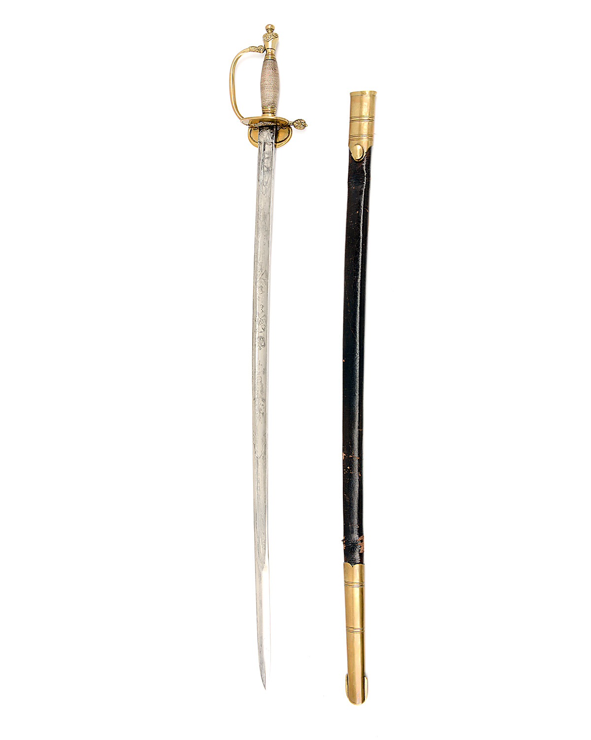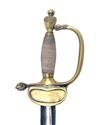 A GOOD REPRODUCTION GEORGIAN INFANTRY OFFICER'S SWORD, of 1796 pattern style, with etched Wilkinson style 31 1/2in. blade, brass folding kidneybean hilt guard, 'D' shaped knucklebow, wirebound grip, urn pommel and complete with its brass mounted black leather scabbard (creased)