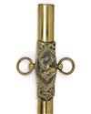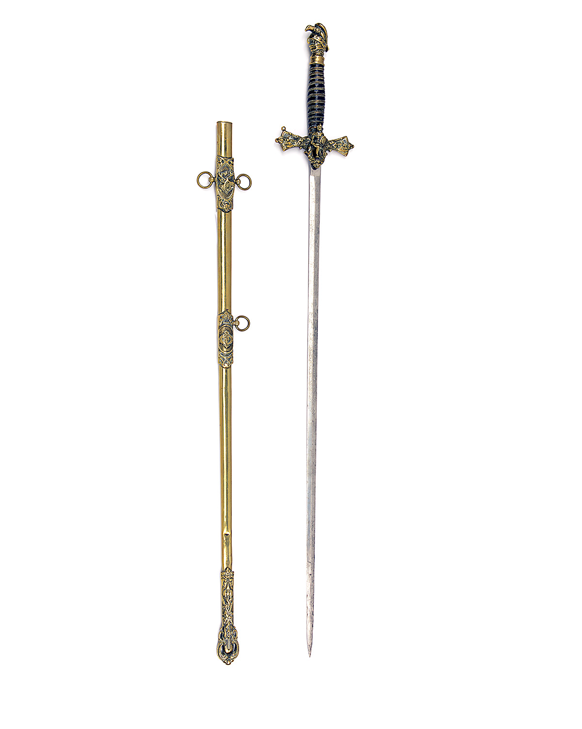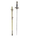 AN AMERICAN SECRET SOCIETY SWORD SIGNED 'G.F FOSTER, SON & CO., CHICAGO' possibly Knights Pythias, with etched straight 29 1/2in. blade (worn), initials to both sides (rubbed), relief cast brass crossguard, knights head pommel, wire bound grip and brass scabbard