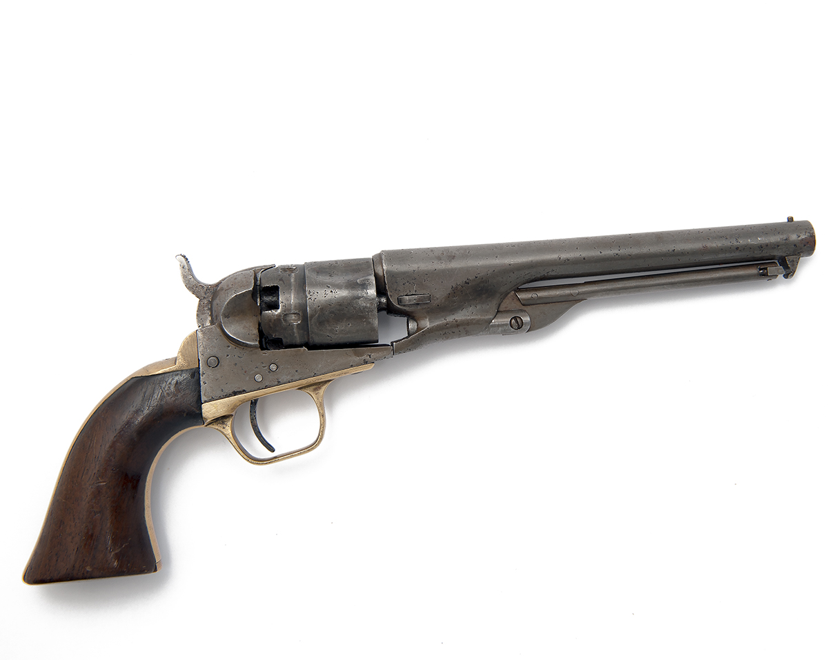 A .36 PERCUSSION REVOLVER SIGNED COLT, MODEL '1862 POLICE', serial no. 14046, for 1862/63, with round 6 3/8in. barrel (scrubbed of address details), stepped and fluted five-shot cylinder, open iron frame, brass grip-straps and smooth walnut grips, worn with some mild pitting