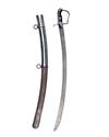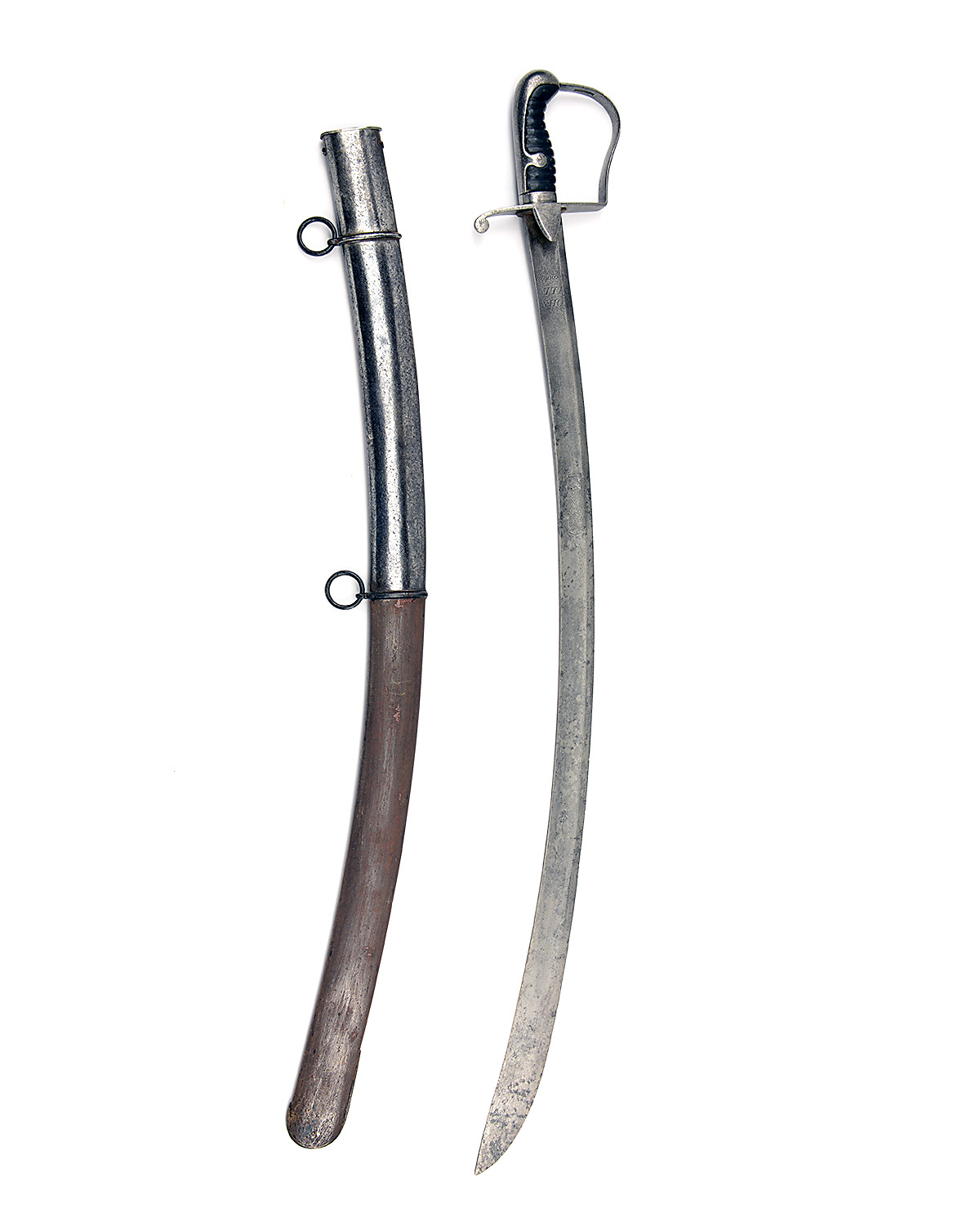 A BRITISH CAVALRY TROOPERS 1796 PATTERN SWORD SIGNED JOHN GILLS, with strongly curving 32 1/2in. blade, the left side etched in a central oval panel 'MAY I CONQUER' (remainder obscured) and signed near the hilt 'JOHN GILLS WARRANTED', 'P' shaped knucklebow, straight cross-guard with pointed langets, ribbed leather grip with reinforcing ears integral with the doves-head back-strap, complete with its iron scabbard, all cleaned and finely pitted