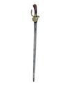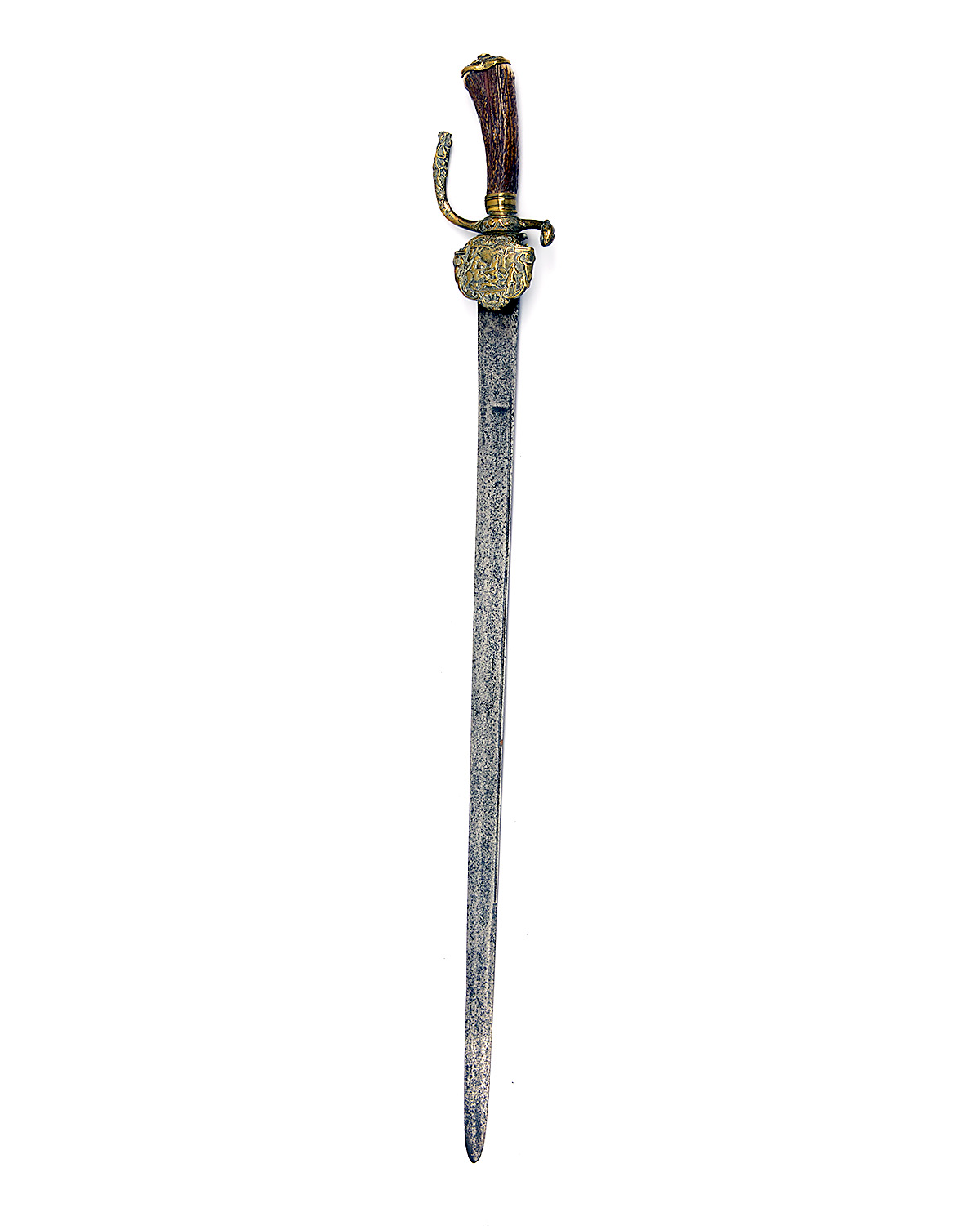 A 17TH CENTURY HUNTING-HANGER, Continental, probably German circa 1650, with straight 25in. bade false edged near the tip, narrow blind fuller to back edge, cast brass hilt with turned down relief carved shell guard, natural stag grip and relief carved pommel, no scabbard, knuckle-bow incomplete