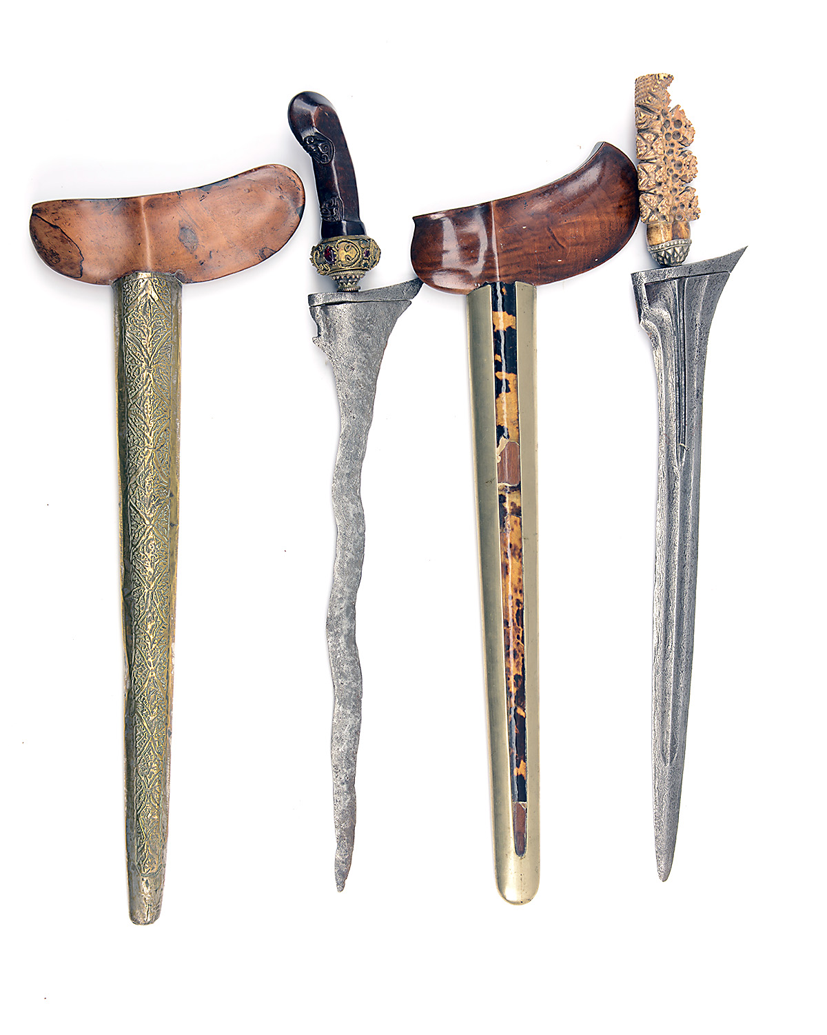 TWO MALAYSIAN KRIS KNIVES, both late 19th to early 20th century, one with straight blade and unusual carved bone hilt, the other with classic wavy blade and wood hilt, both in metal covered scabbards