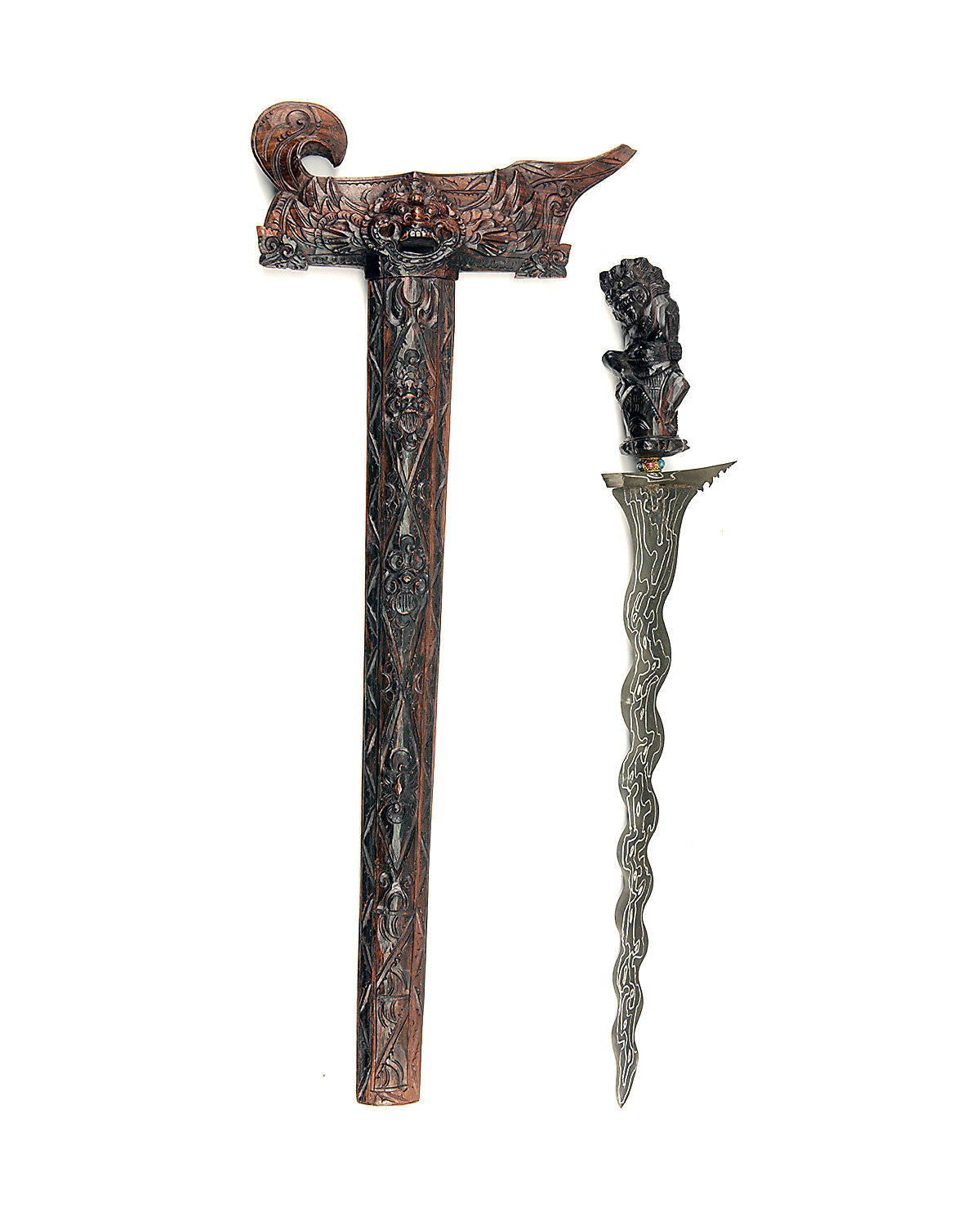 A LARGE MALAYSIAN KRIS KNIFE IN HAND CARVED SCABBARD, for the tourist market, with false damascened 15 1/2in. wavy blade, wood hilt carved in the image of a malaysian deity and ornate carved wood scabbard