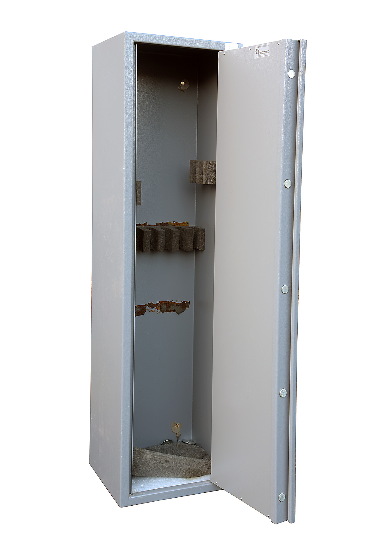 A BRITISH APPROVED STEEL GUN CABINET, fitted for 10 guns, measuring approx. 60in. x 16in. x 13 1/2in. (including keys
