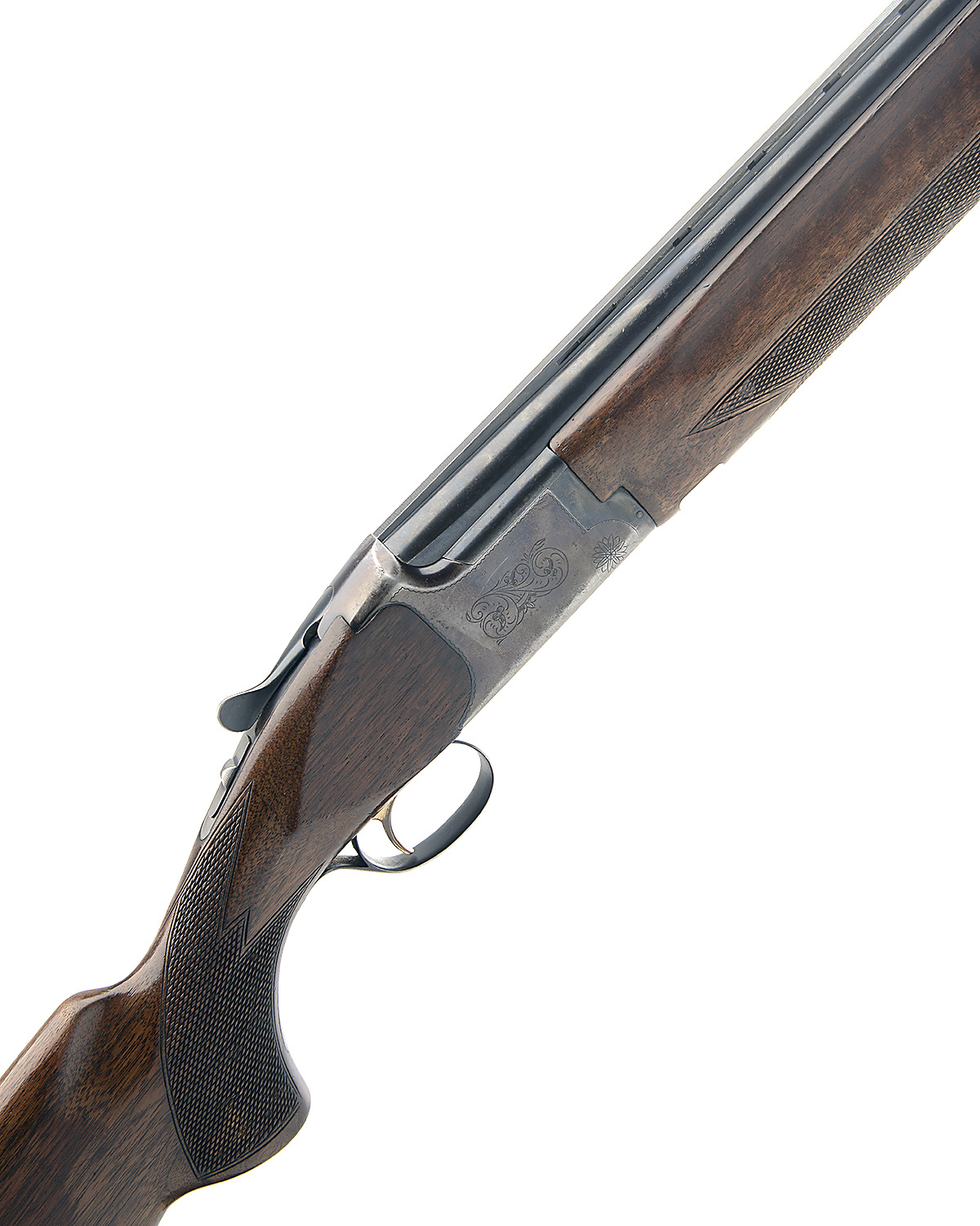 B.C. MIROKU 12-BORE SINGLE-TRIGGER OVER AND UNDER EJECTOR, serial no. 726987, 26in. nitro barrels with 7mm ventilated matt top-rib, 2 3/4in. chambers, bored approx. 1/4 choke in both, hold-open toplever, automatic safety with integral barrel selector switch, gold-washed single trigger, border and partial scroll engraving, blacked finish, 14 1/4in. pistolgrip stock including buttplate