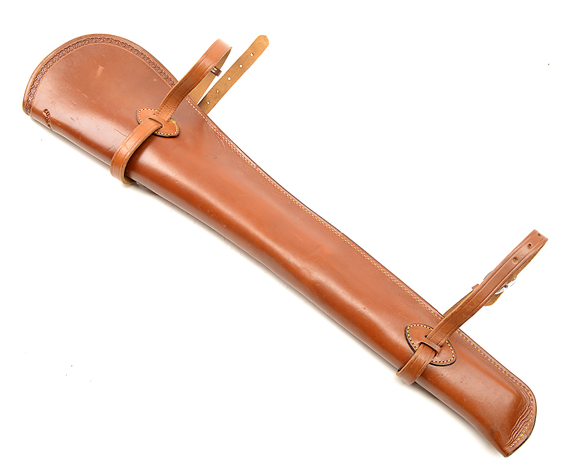 A TAN LEATHER SADDLE GUNSLIP, with tooled edges and straps