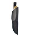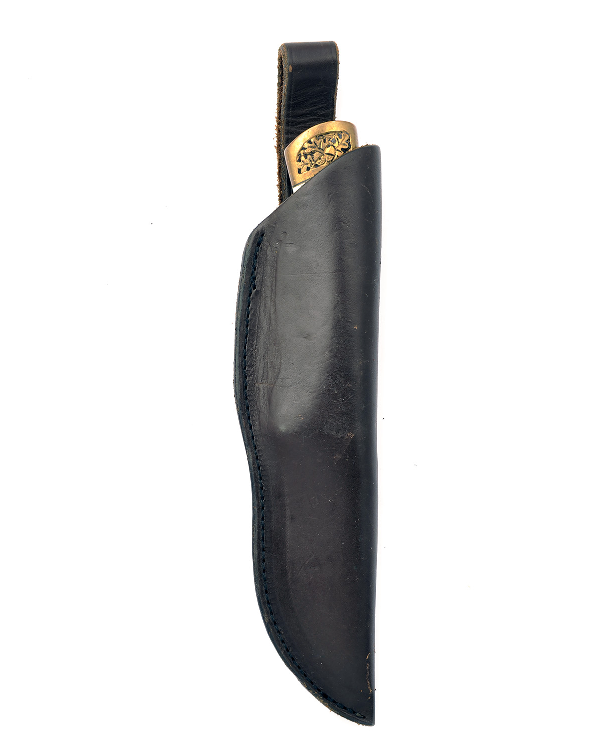 with 3 1/2in. drop-point blade, engraved brass bolsters and natural stag scales, in its leather scabbard, light use only