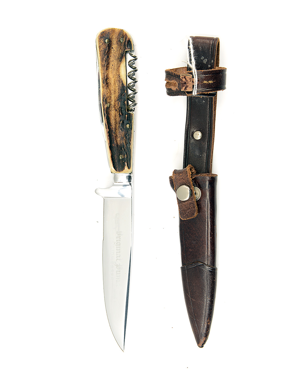 with spearpoint partly serrated 4 1/4in. blade, natural staghorn scales with an additional folding saw and gutting blade in the handle and complete with its brown leather sheath, together with its green pebbled card carton with satin inner liner (box end torn, some wear to scabbard)