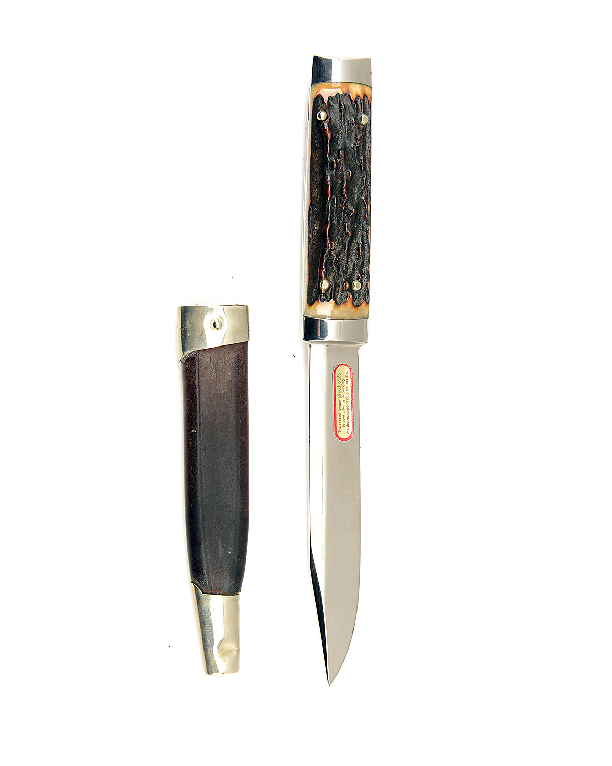 8in. overall with natural staghorn scales and complete with its white metal and leather scabbard (dented at drag), in its maker's plastic green and yellow box