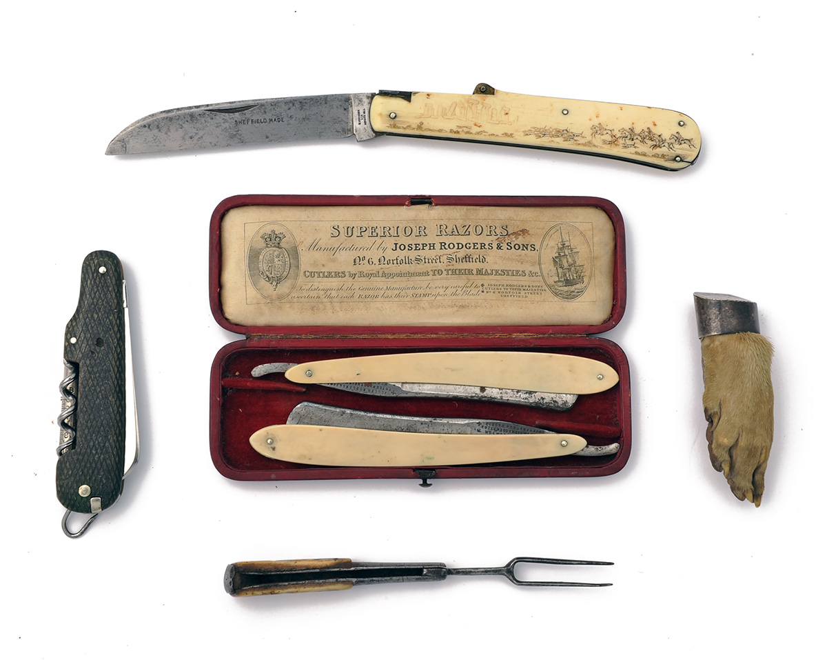 including a cased pair of Joseph Rodgers cutthroat razors with ivory handles, an ivory handled large sporting knife signed 'M. VERINDER, LUDGATE HILL' and scrimshawed with a scene of stonehenge (as found), an Abercrombie & Fitch multi-bladed sportsmans knife with weighing device signed 'RODGERS', a stag handled folding eating fork (possibly Georgian) and a silver mounted otter's foot hallmarked for 1925 and engraved 'E.c.o.h. BUCKENHAM MILL, WEIGHT 16lbs AUGT. 3RD 1925'