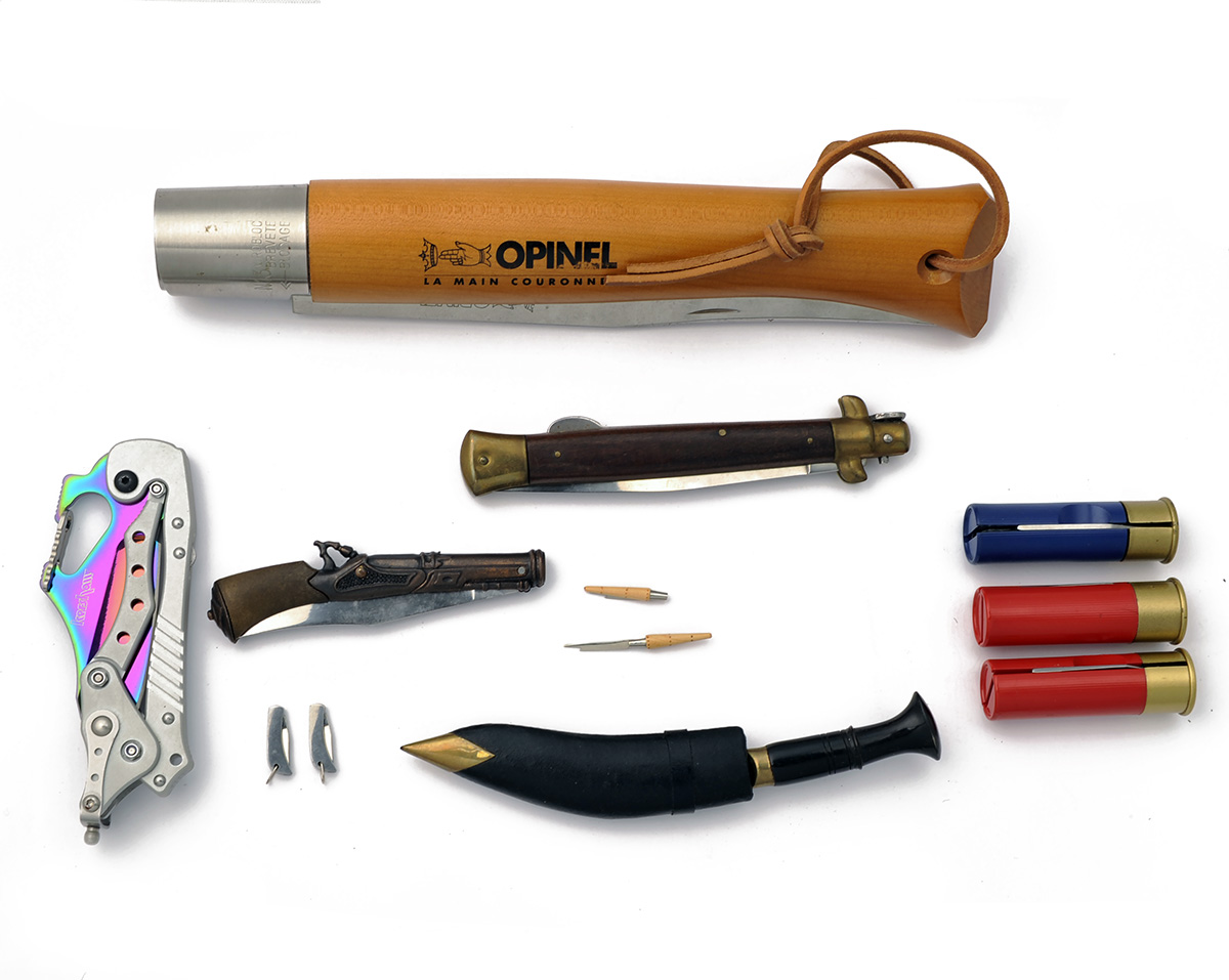 including an oversize Opinel, a cantilever Rainbow Kershaw, 'cartridge' advertising knives, a miniature kukri etc,