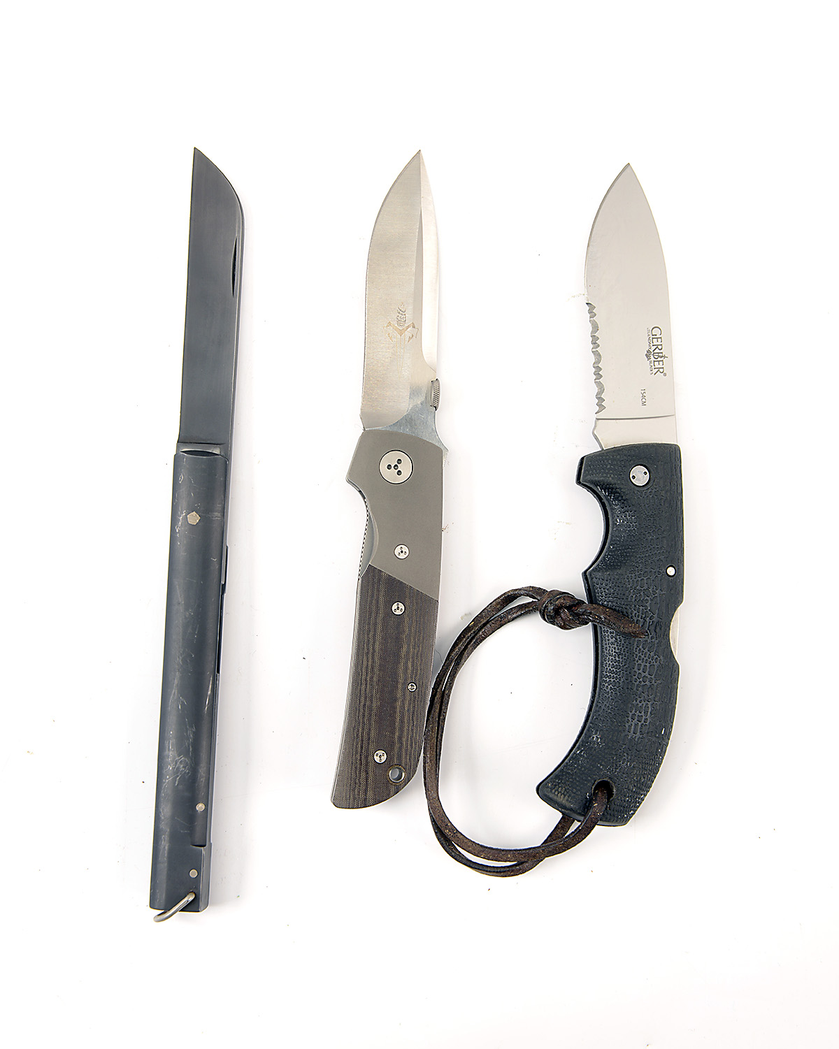 the first signed Gerber with rubber 'Gator' handle, the second signed I.A.N., Brazil, the last signed Microtech with micarta scales, all appearing little used
