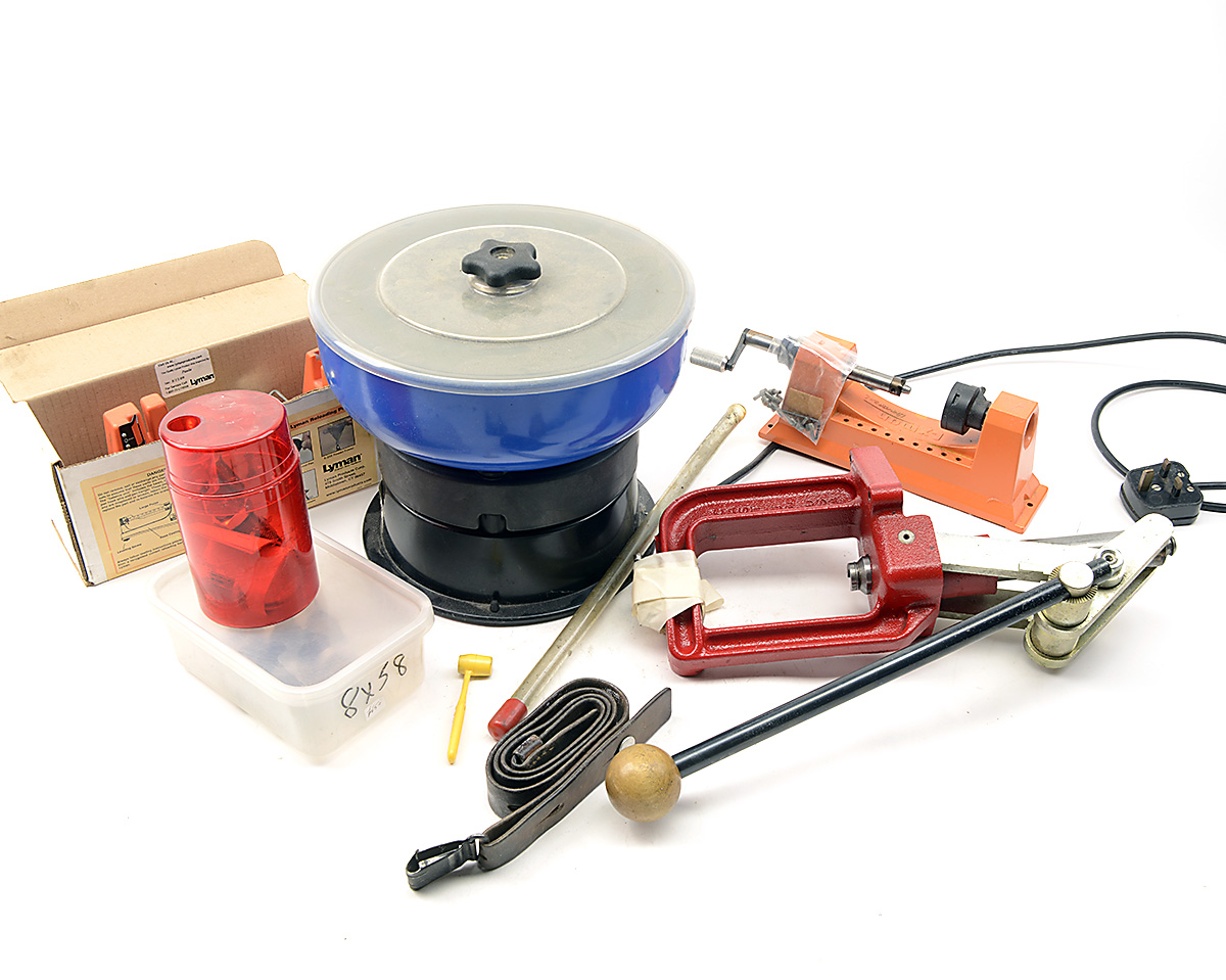 A COLLECTION OF CARTRIDGE RELOADING ITEMS, comprising of a model 400 cartridge tumbler, a Lee loading press, a set of three 8x56 reloading dies, Lyman powder scales, Lyman turning tool,