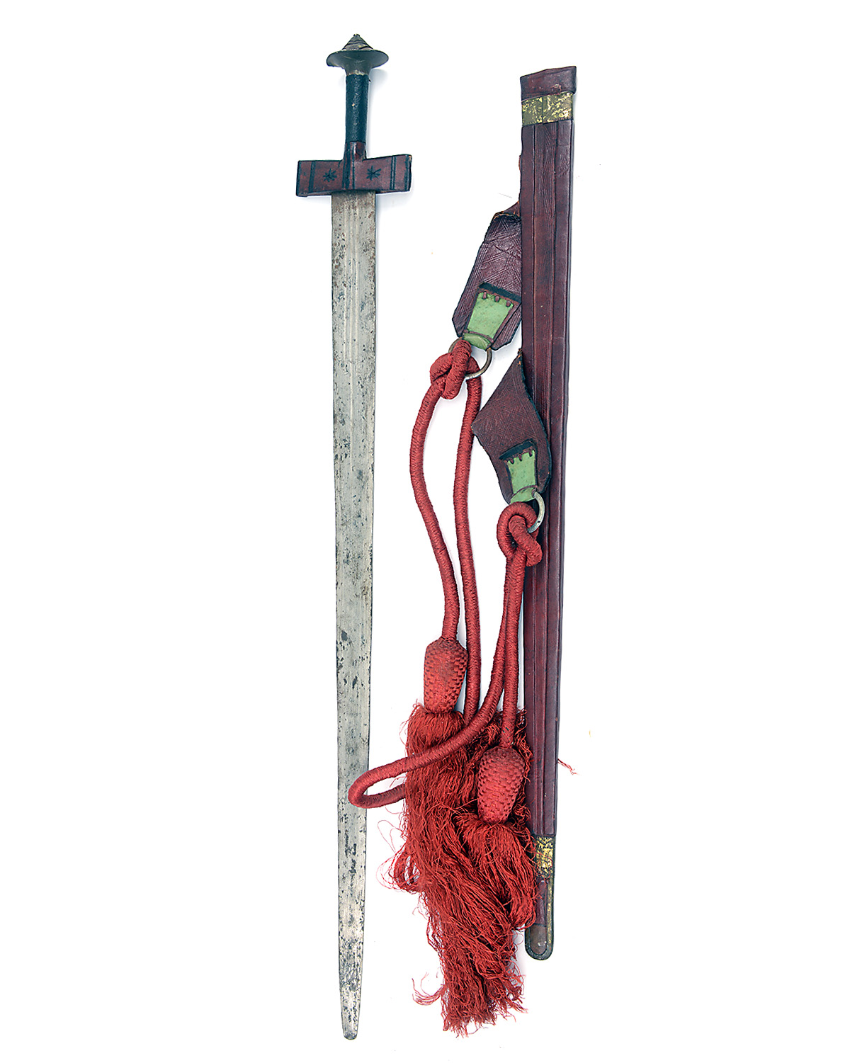 A NORTH AFRICAN TOUAREG SWORD, with straight 31in. blade, cruciform hilt, sheet iron conical pommel and red leather scabbard