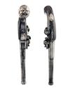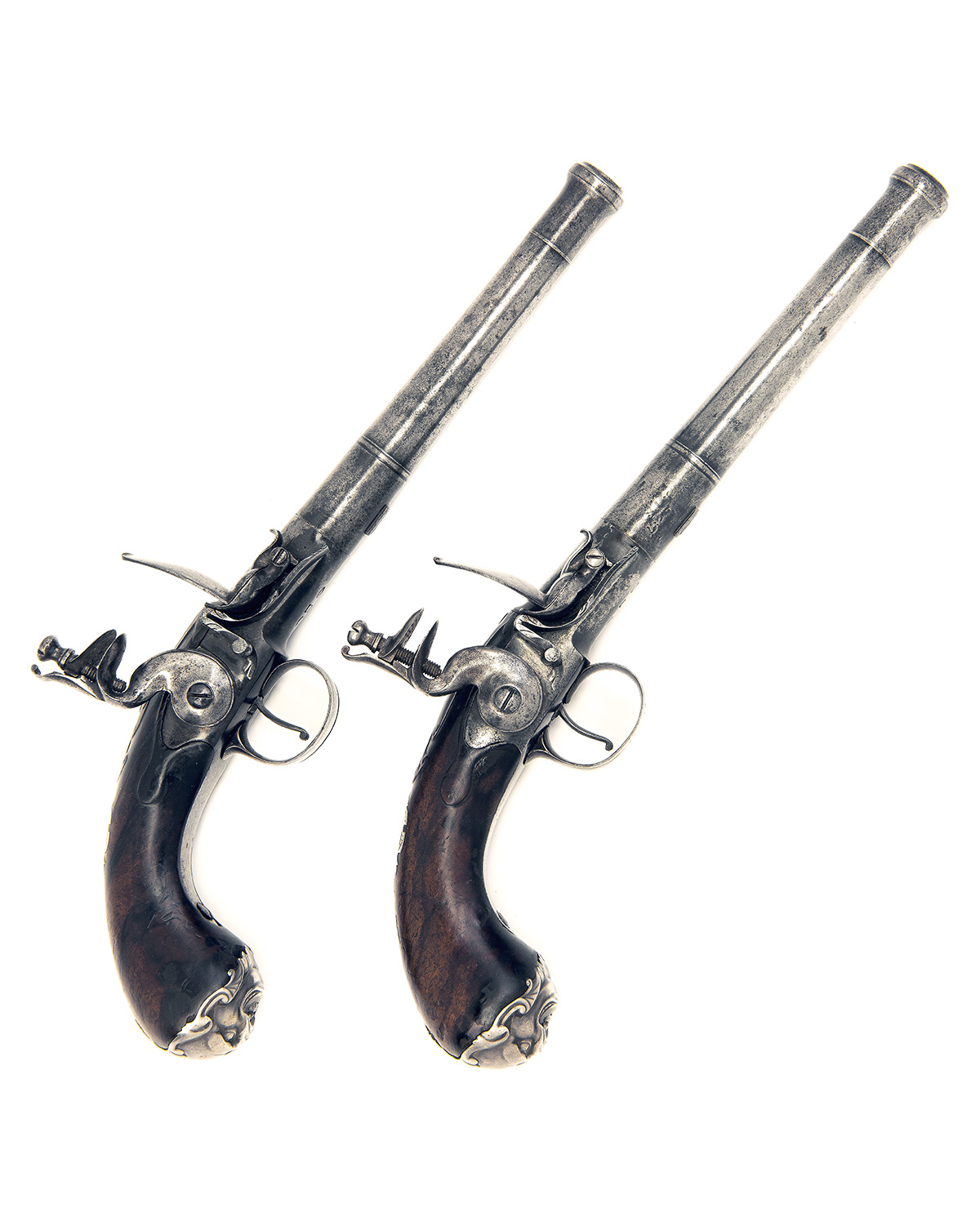 circa 1760, with 6 1/4in. turn off cannon barrels, London proofs and maker's mark to underside of breech, the tops with 'I. DREW, LONDON (rubbed), applied top-tangs with scroll engraving, radiused action bodies, borderline engraved cocks (one repaired at neck), carved frizzen springs, walnut grips (one cracked behind top-tang) swelling at the pommel and mounted with white-metal grotesque mask butt-caps, carved aprons around the top-tang, complex white metal escutcheons at wrists, moulded trigger-guard bow safes and pierced white-metal side-plates