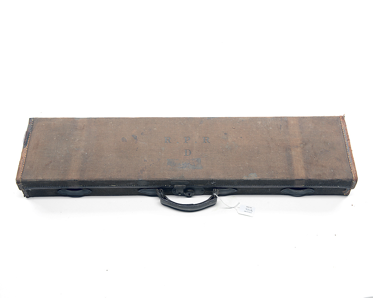 A BRADY TYPE BROWN CANVAS AND LEATHER SINGLE GUNCASE, fitted for 30in. barrels, the interior lined with maroon baize, brass lock (key missing)